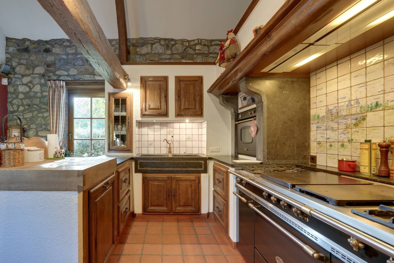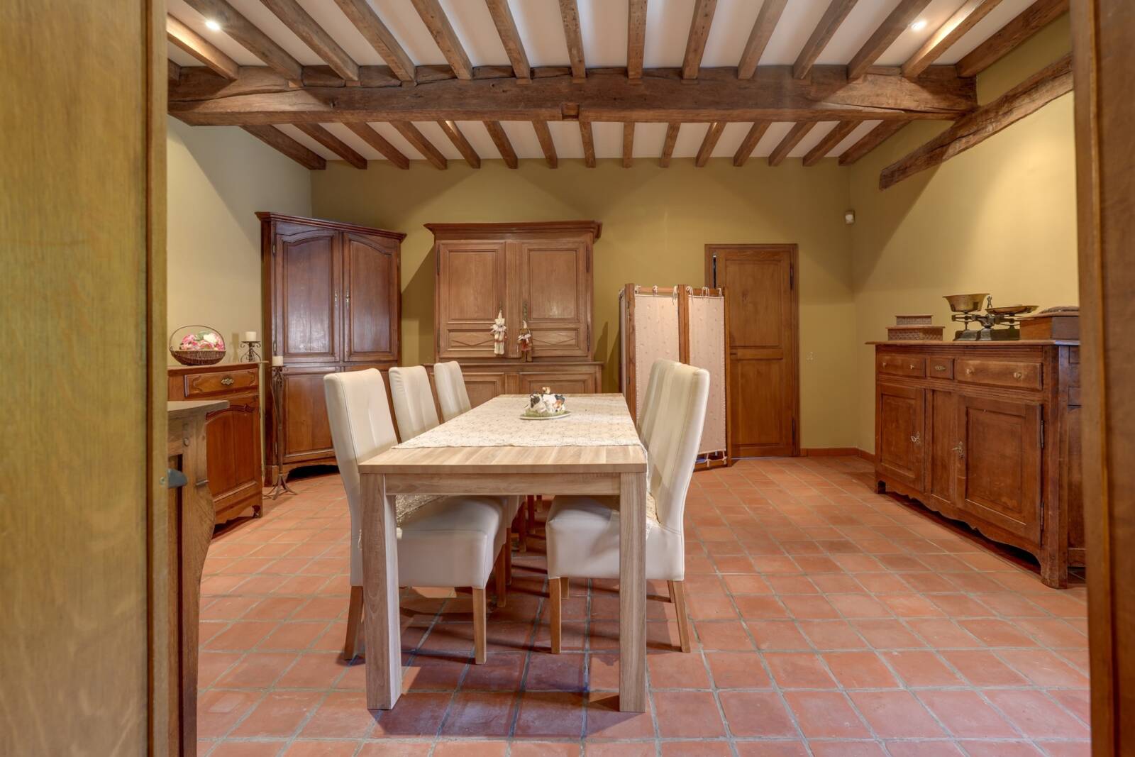 Les espaces de vie profitent d’un chauffage au sol et se composent d’un salon avec poêle à bois et espace bar, d’une salle-à-manger agrémentée de « voussettes », et d’une vaste cuisine équipée d’une cuisinière Lacanche à 7 foyers ainsi qu’un cellier.