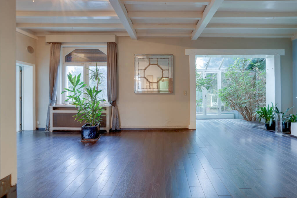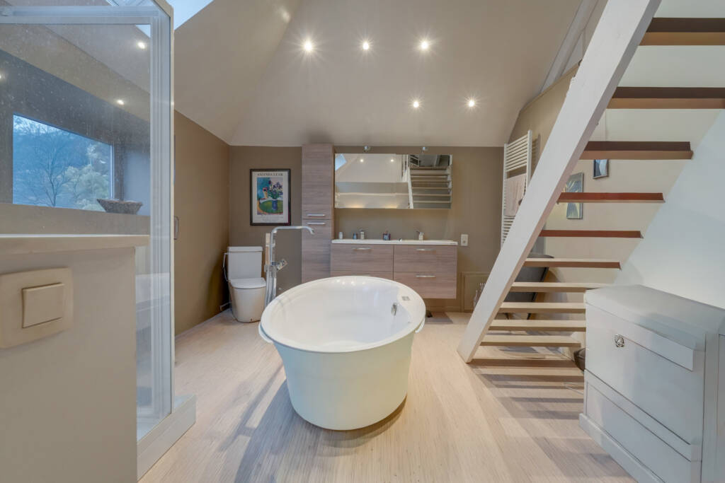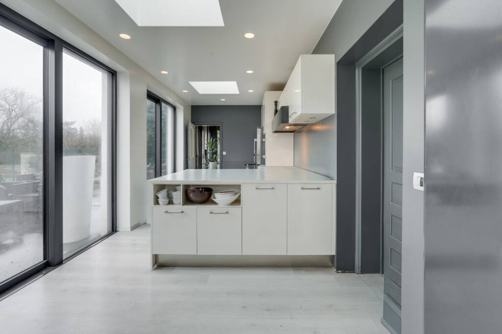La maison, aux volumes généreux, offre un cadre de vie raffiné et confortable. Les larges baies vitrées baignent les pièces de lumière naturelle et s’ouvrent sur de superbes vues dégagées sur la nature environnante, renforçant la sensation d’espace et de sérénité.