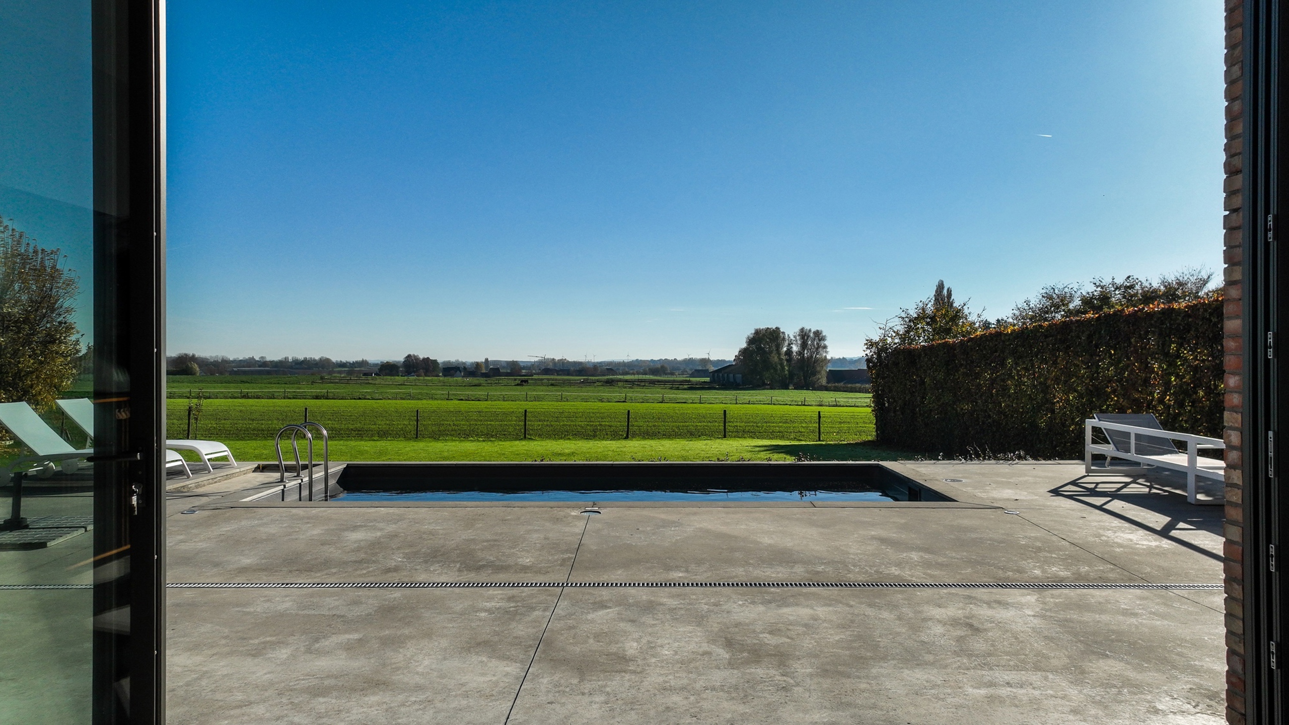 La pièce de vie principale impressionne par sa hauteur sous plafond, ses lignes épurées et sa luminosité exceptionnelle. Le salon, prolongé par une vaste baie vitrée ouverte sur la campagne, s’articule autour d’une cheminée intégrée et d’une vue panoramique sur la nature environnante. La cuisine ouverte, parfaitement équipée et dessinée sur mesure, se veut conviviale et élégante, avec son vaste îlot et sa table suspendue.