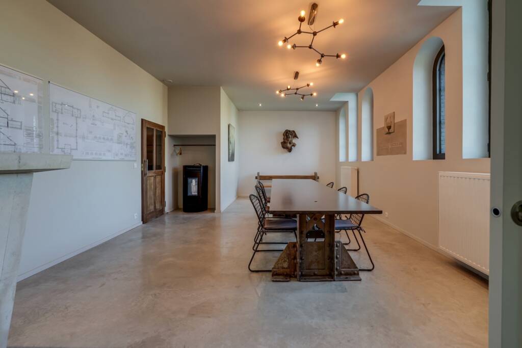 Dès l’entrée principale, marquée par les portes d’origine et les vitraux soigneusement préservés, le ton est donné : chaque détail a été pensé pour magnifier l’âme du lieu tout en offrant un confort contemporain irréprochable. Un second accès mène directement vers les différents espaces de vie.