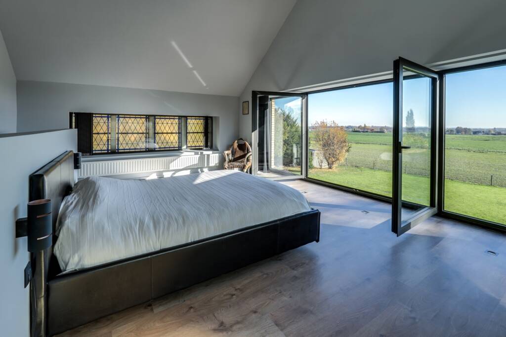 À l’étage, la suite parentale surprend par ses dimensions et son toit cathédrale. Elle bénéficie d’un dressing sur mesure, d’une salle de bain privative et d’une vue dégagée sur la campagne grâce à une large baie vitrée. Trois autres chambres, dont une en duplex, disposent chacune de leur salle de bain. Une pièce supplémentaire d’environ 80 m², avec charpente apparente Eiffel, propose un potentiel remarquable : atelier, salle de jeux, studio indépendant, ou chambre supplémentaire.