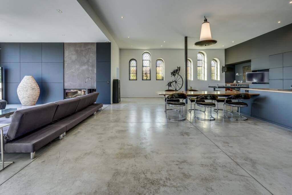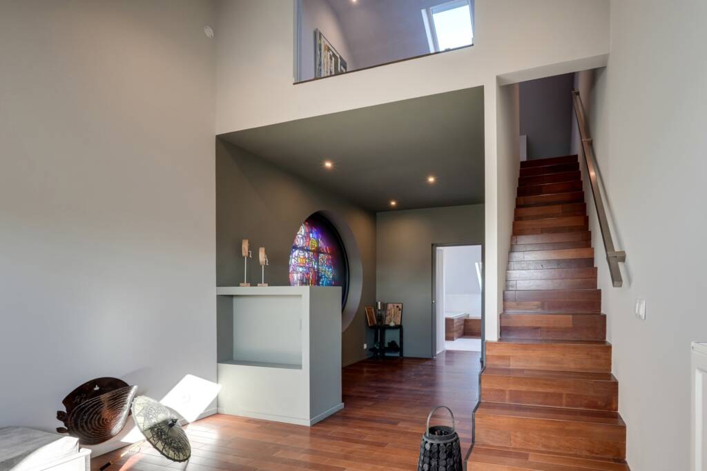 Dès l’entrée principale, marquée par les portes d’origine et les vitraux soigneusement préservés, le ton est donné : chaque détail a été pensé pour magnifier l’âme du lieu tout en offrant un confort contemporain irréprochable. Un second accès mène directement vers les différents espaces de vie.