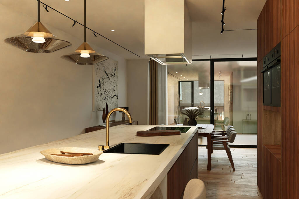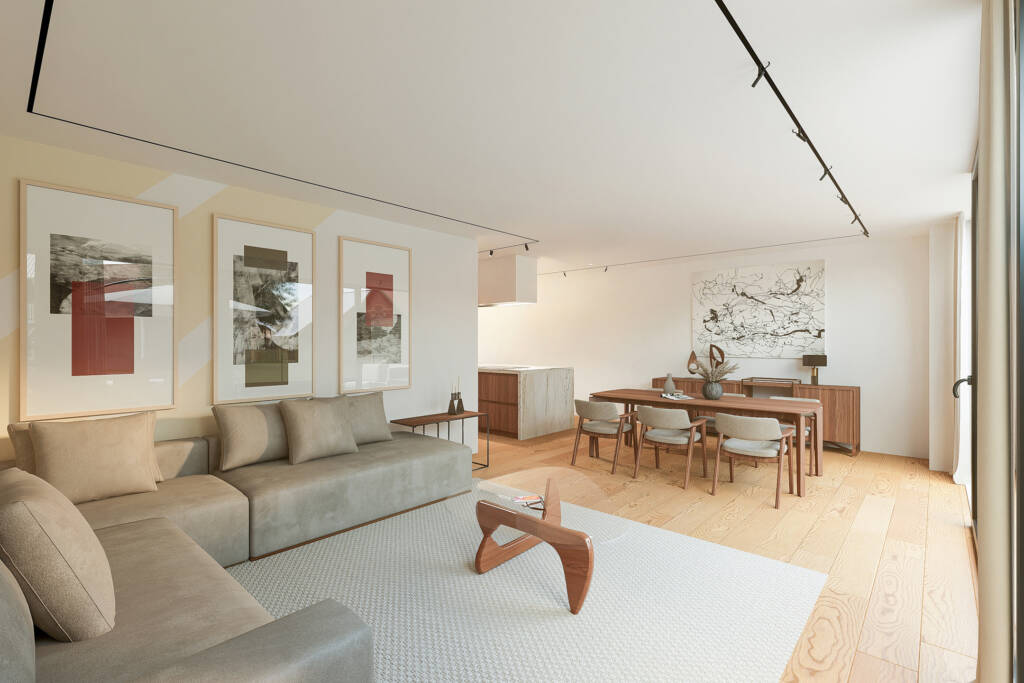 – R+1 : Hall avec buanderie et WC séparé avec lave-mains, séjour avec cuisine équipée ouverte (valeur : 12.500 € HTVA)