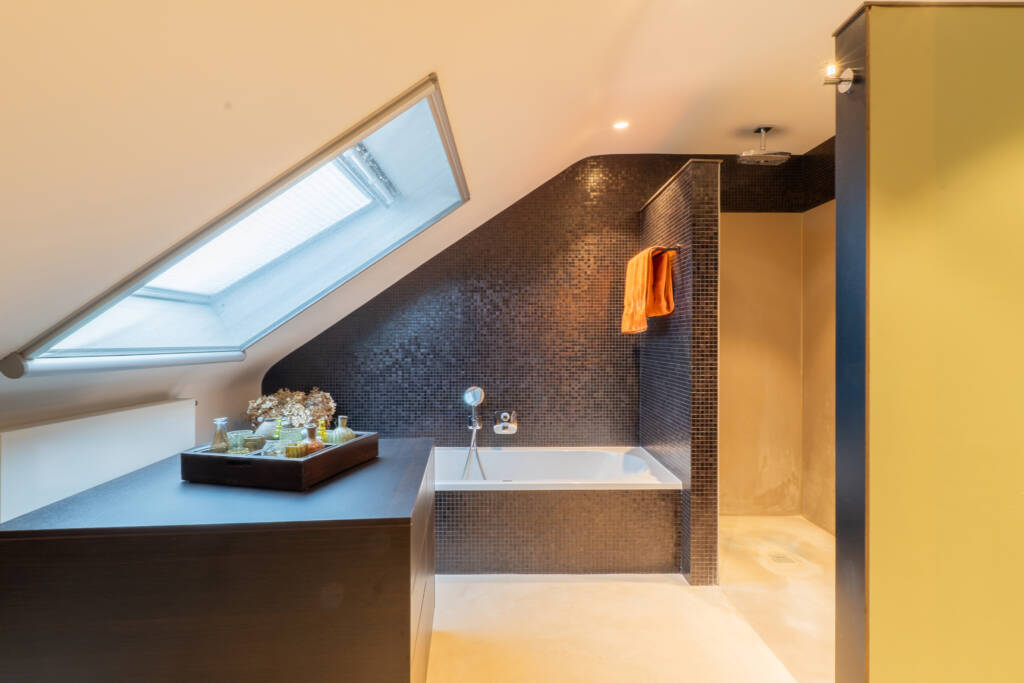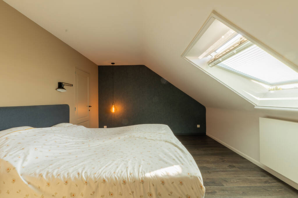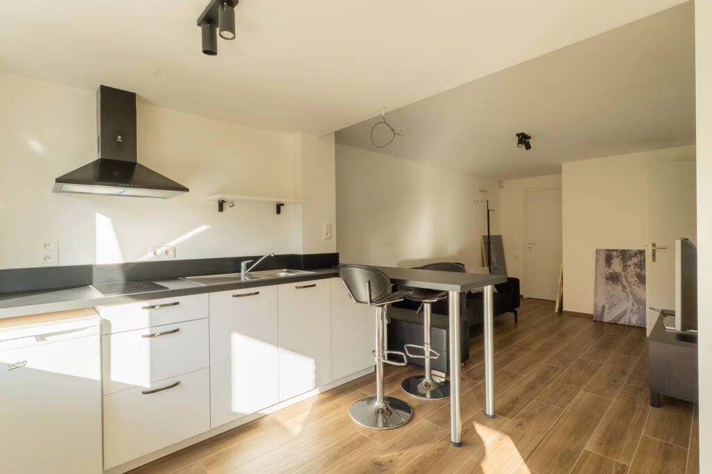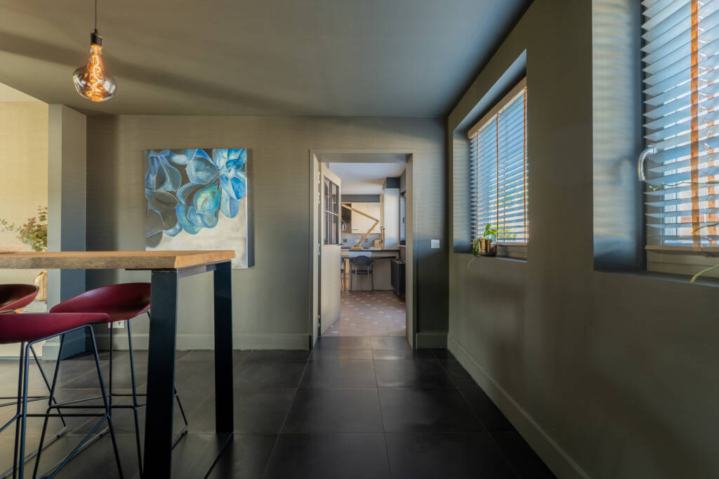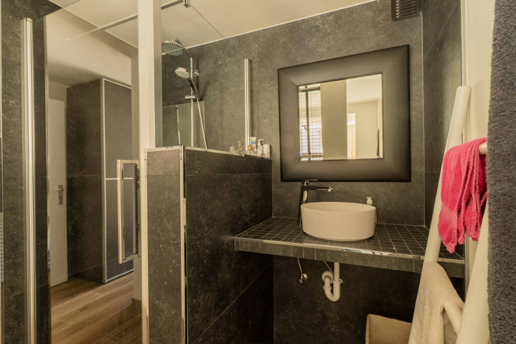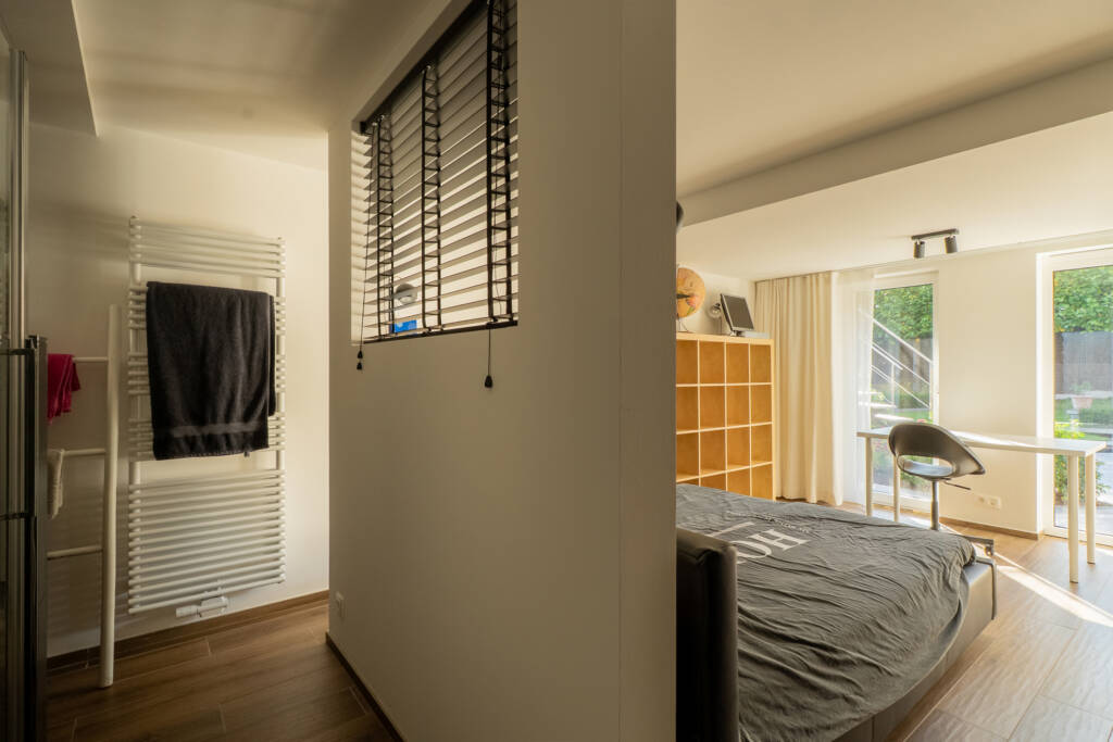 Le rez-de-chaussée accueille également un grand studio indépendant, comprenant un espace de vie, une cuisine avec coin repas, une chambre et une salle de bains. Celui-ci profite d’une vue dégagée et d’un accès au jardin, accessible tant depuis le hall d’entrée que depuis le garage, offrant ainsi de multiples possibilités d’aménagement (logement indépendant, profession libérale, espace invités).