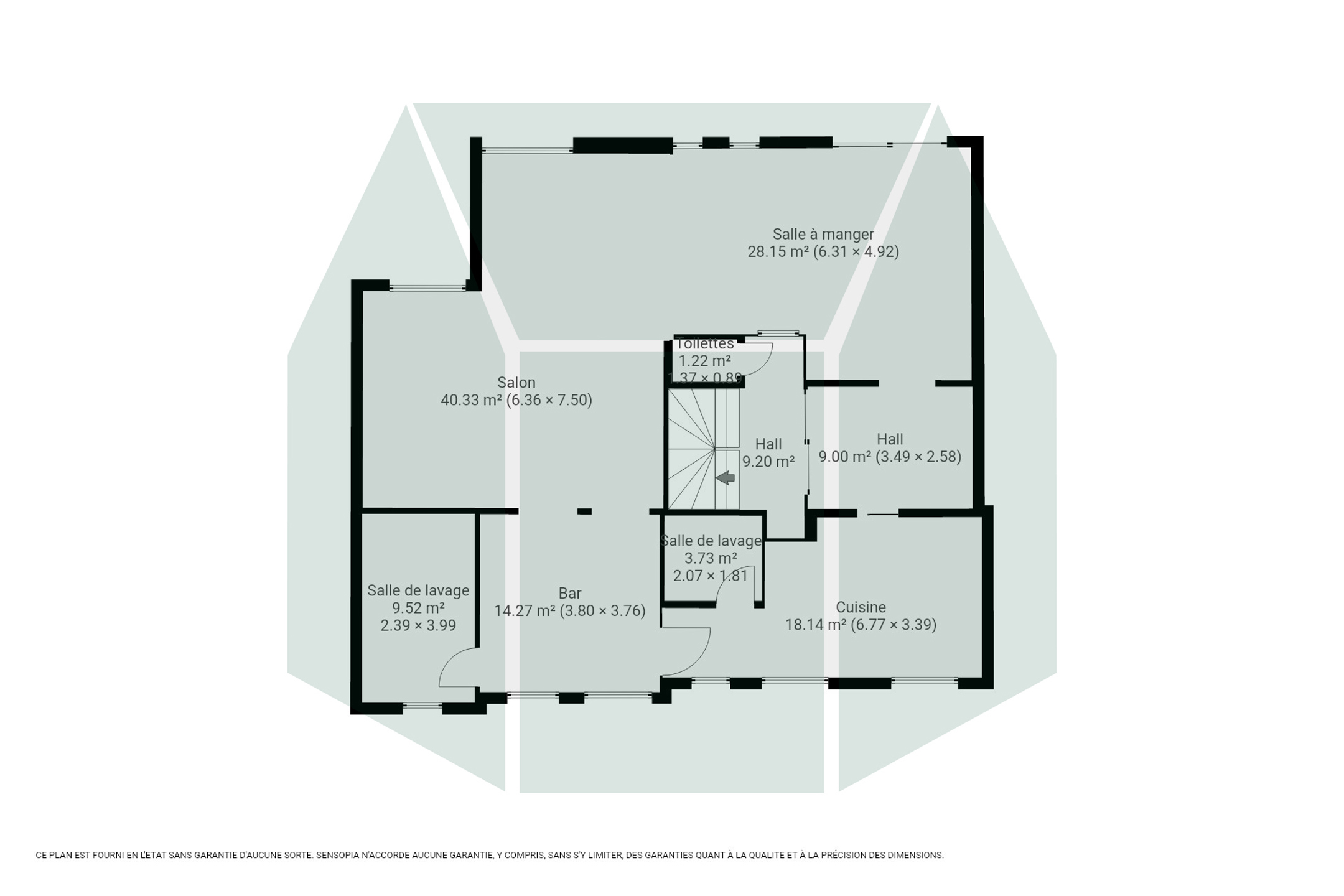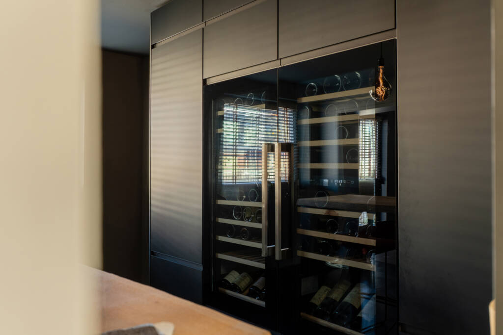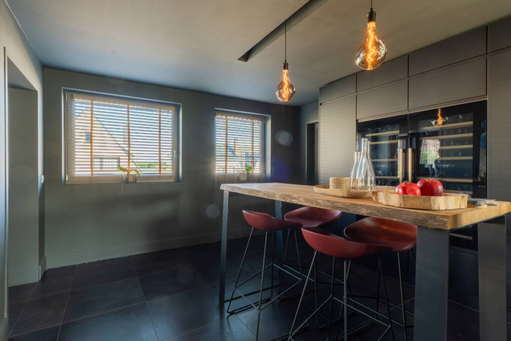 Ce niveau comprend également une salle à manger, une grande cuisine entièrement équipée, un espace bar avec cave à vin, un WC avec lavabo, un bureau lumineux, ainsi qu’un débarras équipé d’armoires et d’un lavabo.