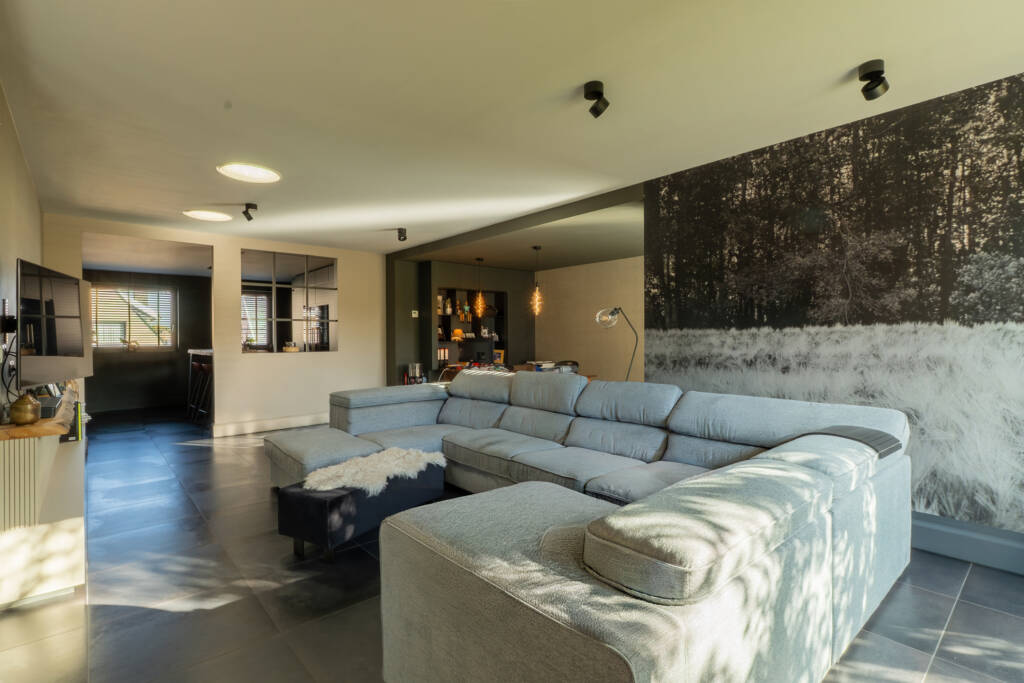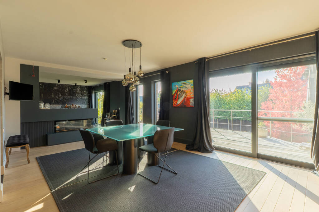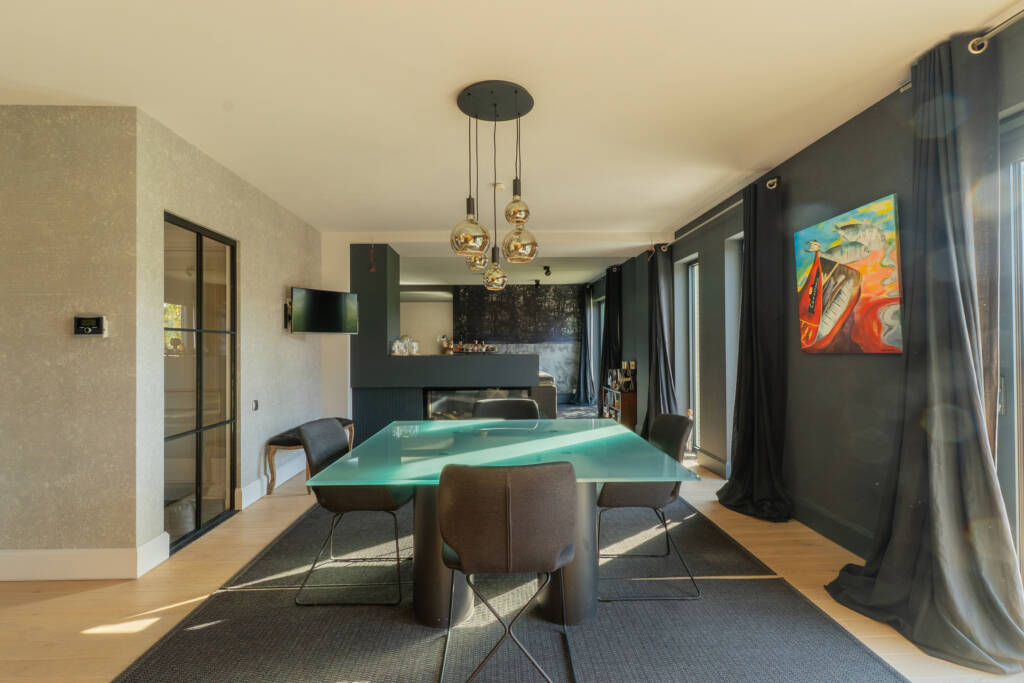 Vous y découvrirez un séjour baigné de lumière de plus de 68 m², offrant une vue dégagée et un accès direct à la terrasse et au jardin grâce à une large baie vitrée coulissante.