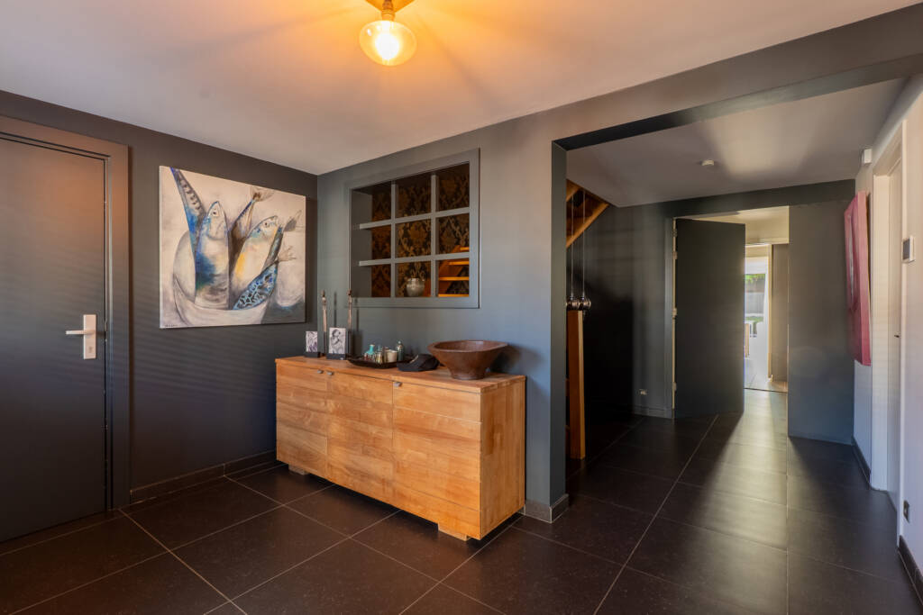 Un vaste hall avec vestiaire et porte vitrée coulissante dessert des pièces aux volumes spectaculaires.