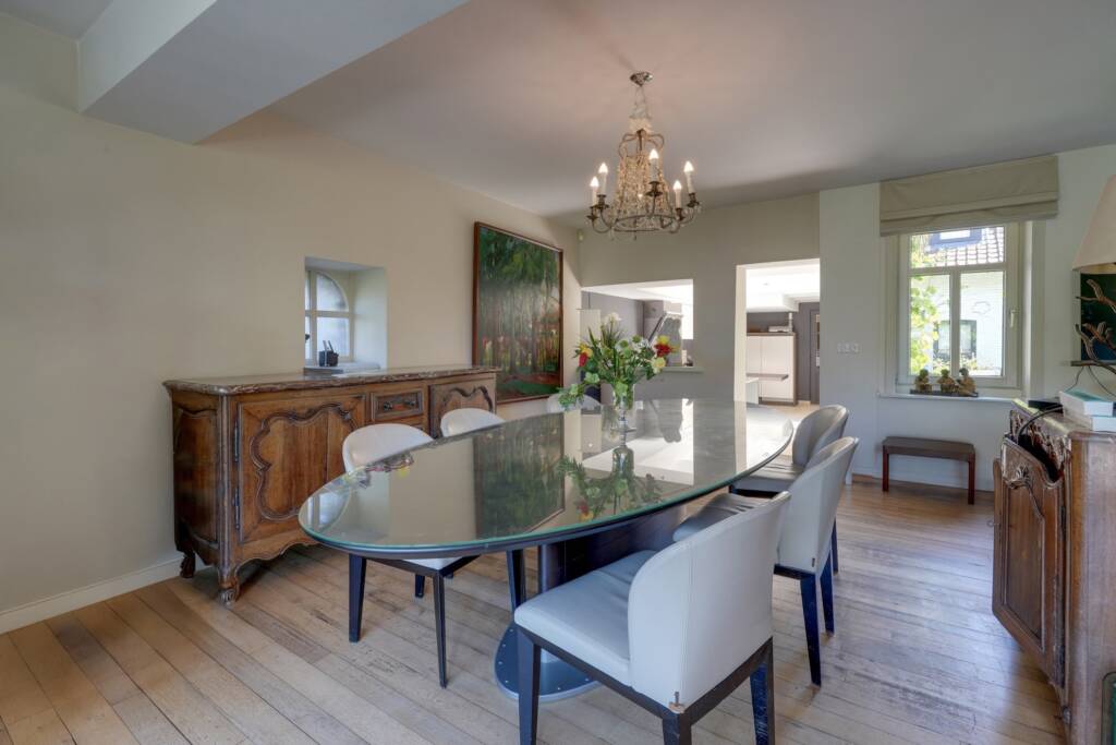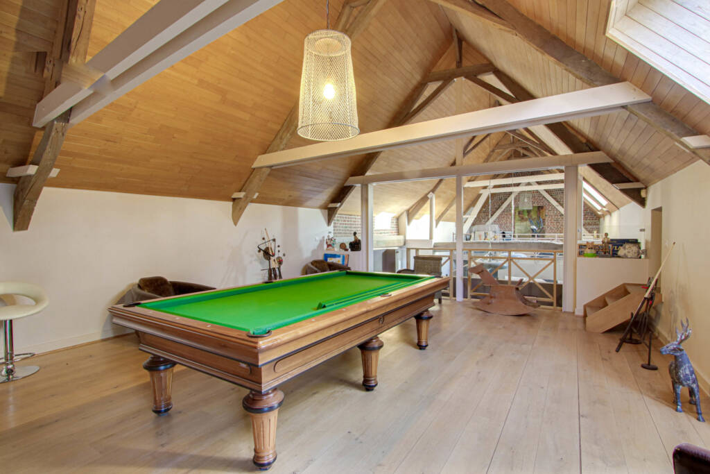 Elle se compose au rez-de-chaussée, d’un vaste séjour avec insert offrant une magnifique vue sur le jardin ainsi qu’une cuisine équipée, d’une somptueuse suite parentale « cathédrale » avec dressing, salle-de-bains privative et accès direct vers le jardin. On y retrouve à proximité un espace détente avec Jacuzzi, douche, vestiaire, ainsi qu’une salle détente avec billard. Enfin, la dernière aile possède une buanderie ainsi qu’un vaste salon de réception avec cheminée. Double garage avec portes motorisée ainsi qu’un espace polyvalent à l’étage.