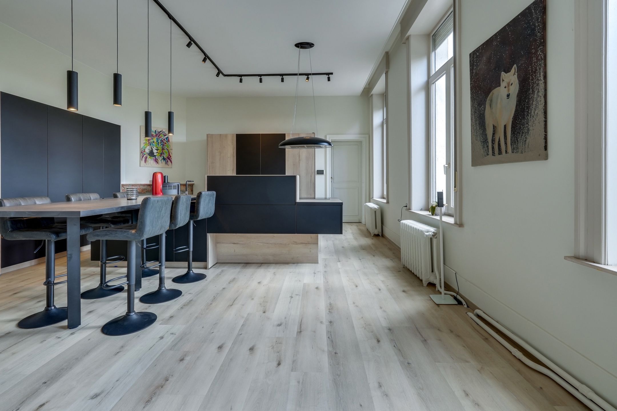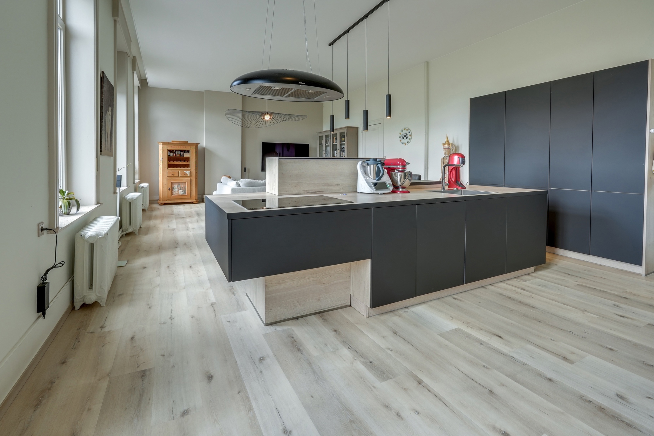 Le premier étage possède un vaste séjour de 60m² avec cuisine ouverte, un bureau, deux chambres et deux salles-de-bain.