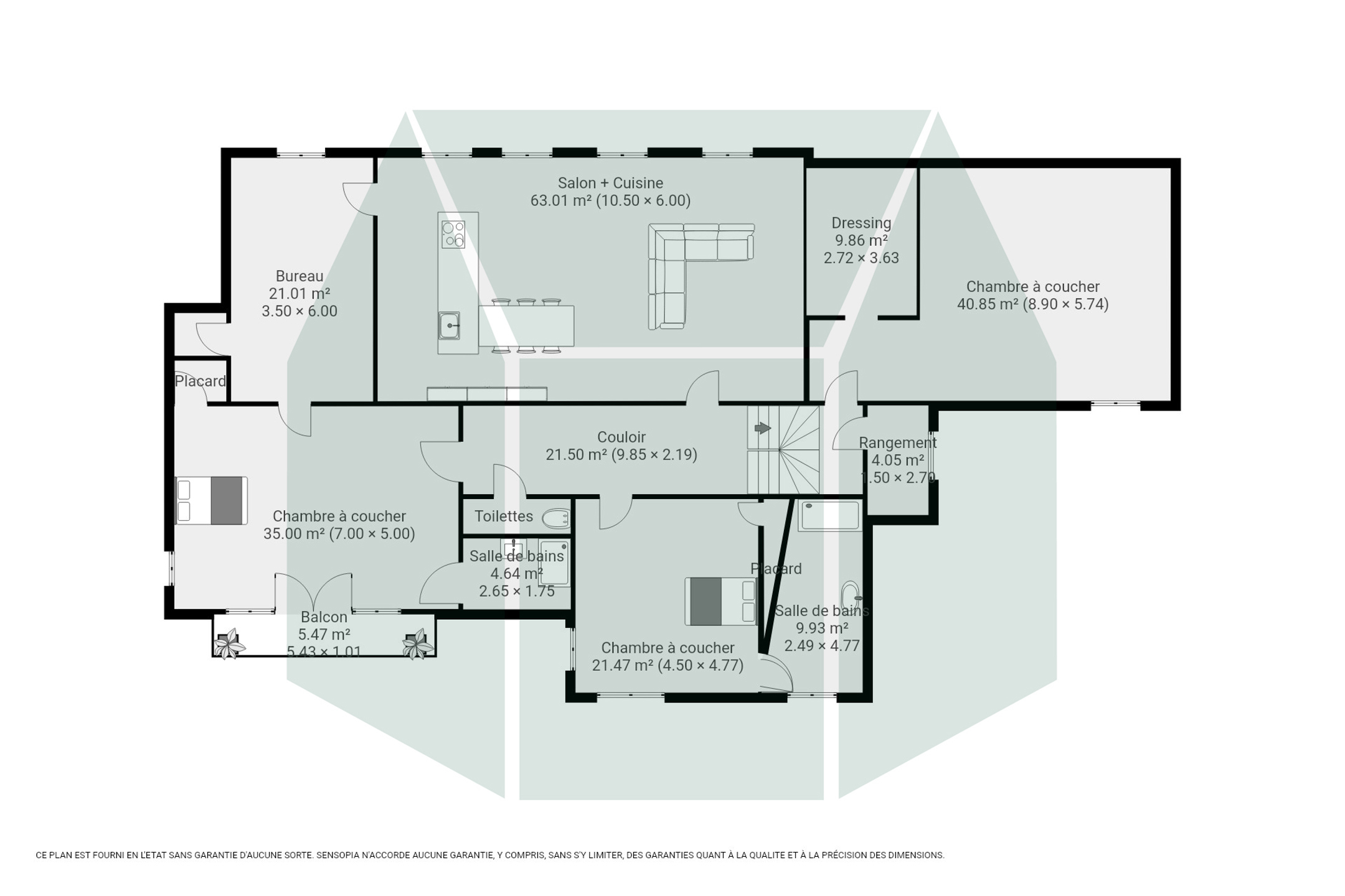Le premier étage possède un vaste séjour de 60m² avec cuisine ouverte, un bureau, deux chambres et deux salles-de-bain.