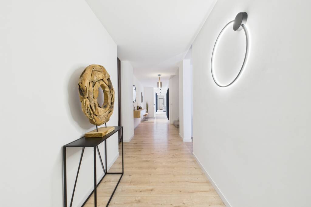 Un hall mène à une élégante suite parentale comprenant une chambre, un dressing et une salle de bains avec baignoire îlot et meuble lavabo.