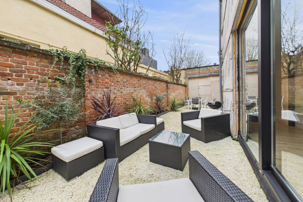 Un patio/terrasse en gravier offre une vue directe sur la pièce de vie. À l’arrière, un jardin entièrement clôturé garantit calme et intimité.