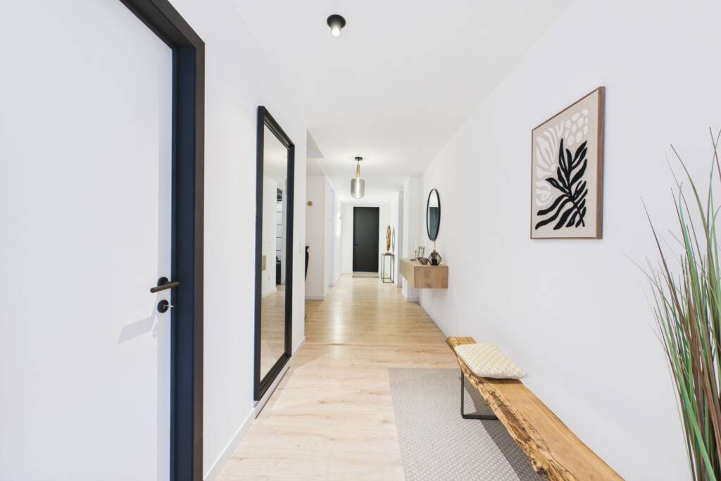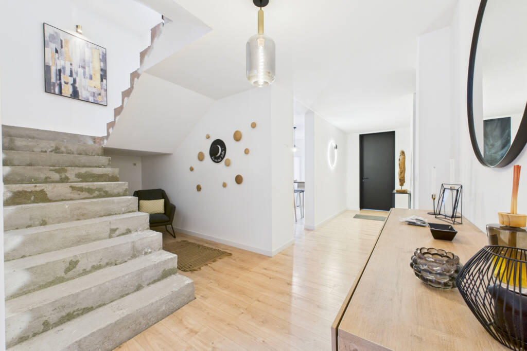 Dès l’entrée, un vaste hall avec escalier apparent structure élégamment les espaces. En façade, une spacieuse cuisine entièrement équipée (plaque de cuisson, hotte, four, lave-vaisselle, double évier, coin repas et nombreux rangements) prend place aux côtés d’un grand garage pouvant accueillir une à deux voitures.