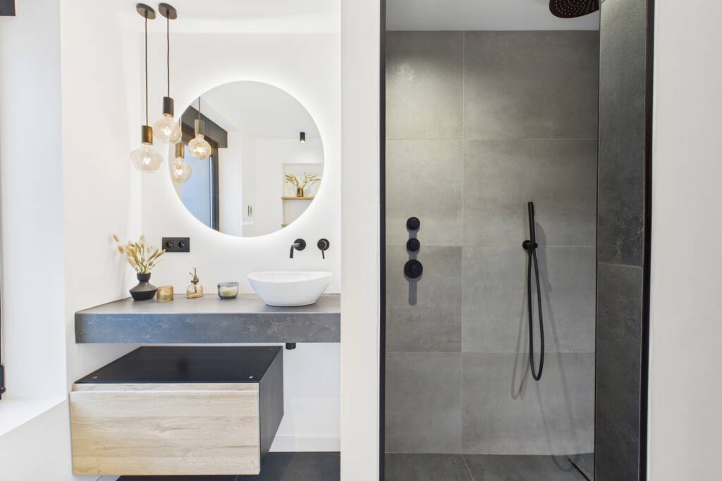 Le hall de nuit dessert trois chambres confortables de 16 m², 11 m² et 11 m², une salle de bains équipée d’une douche à l’italienne et d’un meuble lavabo, ainsi qu’un WC suspendu séparé.