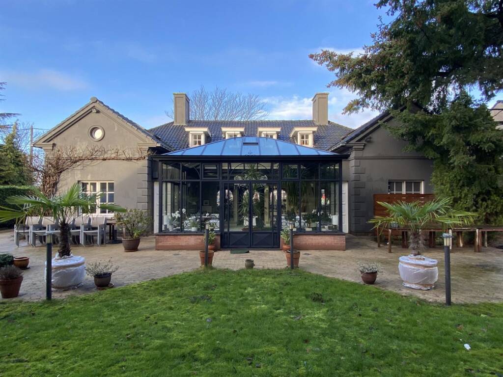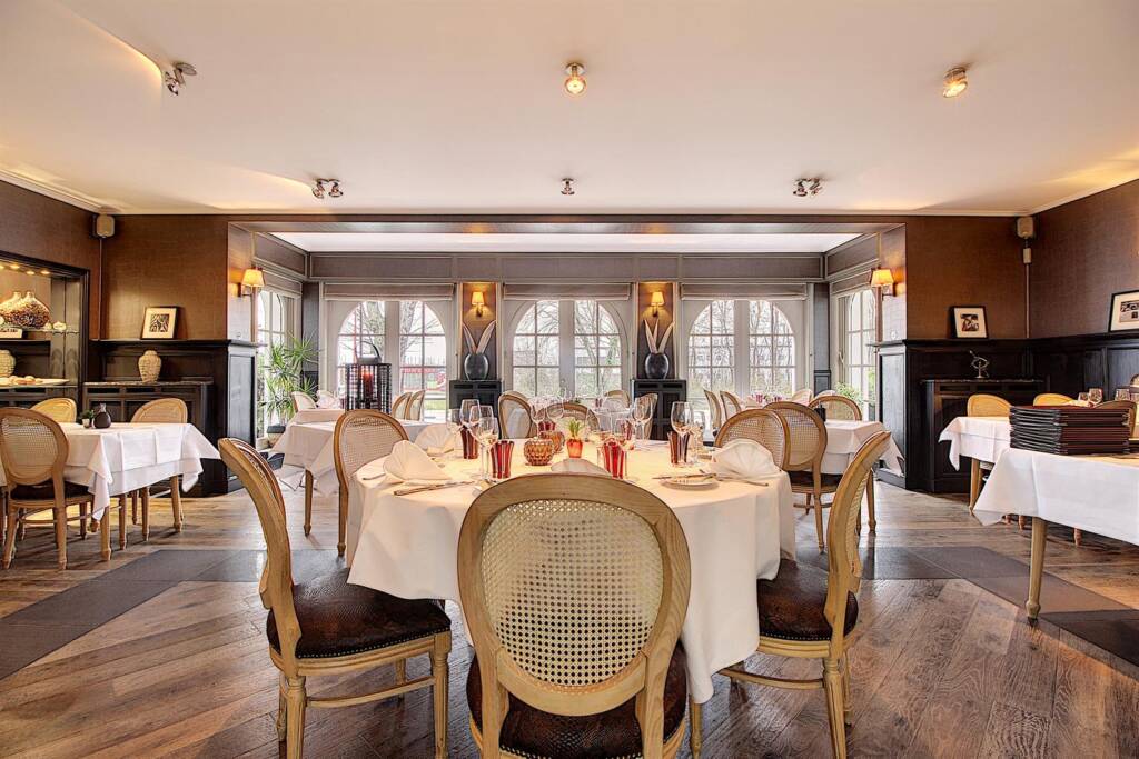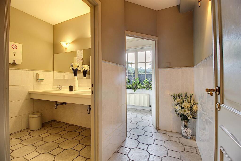 La salle de réception principale peut accueillir +/- 40 couverts ainsi qu’une imposante véranda considérée comme ‘orangerie’ pouvant accueillir +/- 30 couverts. Une terrasse vous permettra de manger en extérieur, au calme, dans un environnement bucolique. Vestiaire et toilettes clientèles prévues à l’entrée.
