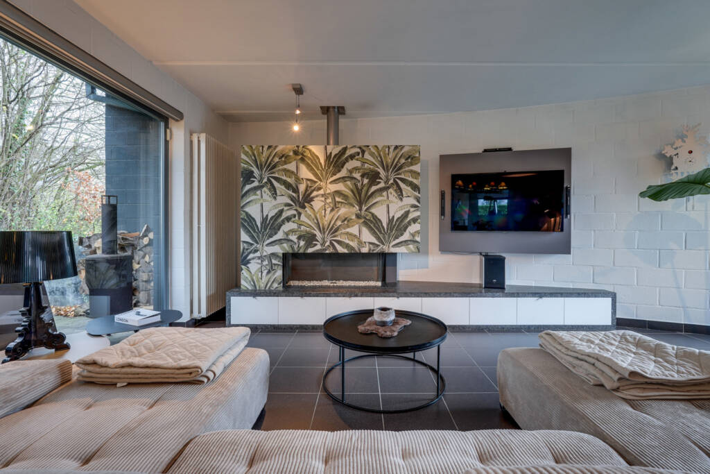 Le séjour lumineux est agrémenté d’un foyer à gaz ouvert, créant une atmosphère chaleureuse et conviviale. La cuisine semi-ouverte attenante constitue un espace central pour cuisiner et partager des moments en famille. Le rez-de-chaussée comprend également un bureau, une buanderie pratique et deux toilettes séparées.