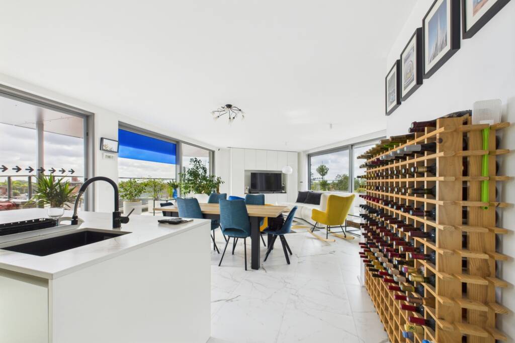 Dès l’entrée, vous accédez à la pièce de vie principale, composée d’un spacieux salon, d’un coin salle à manger et d’une cuisine ouverte entièrement équipée. L’ensemble s’ouvre sur une superbe terrasse offrant une vue imprenable sur le parc.