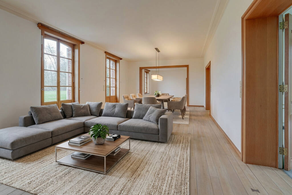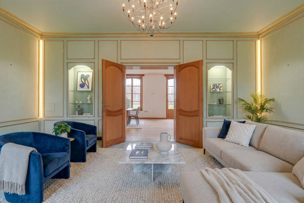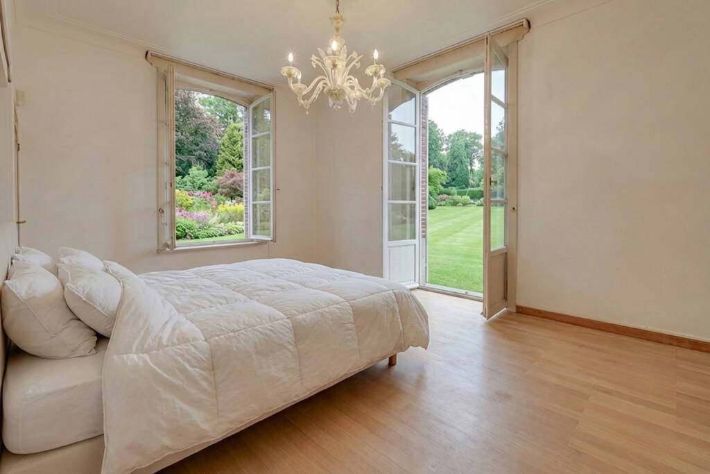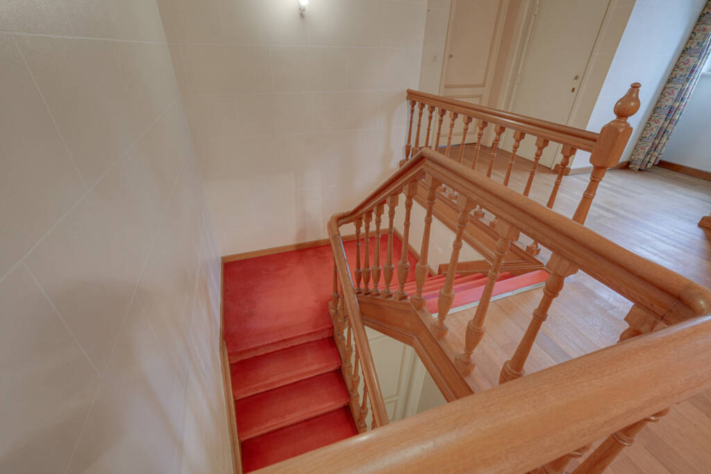 Vaste hall d’entrée, boudoir feutré, majestueux SALON DE RÉCEPTION (feu ouvert en pierre naturelle), 7 chambres (2 au rez, 5 à l’étage), plusieurs salles d’eau, cuisine, office, BUREAU, … ne sont que quelques uns des atouts de cette Maison avec un grand M. Vous profiterez également d’un grand garage pour 5-6 véhicules et d’une très GRANDE PISCINE intérieure. Les sous-sols ne sont pas en reste : SOUS TOUTE LA MAISON principale on retrouve de nombreuses et grandes caves (dont deux caves à vin) et une SALLE DE RECEPTION actuellement à usage de salle de chasse sont à votre disposition. Au total, environ 647 m² de surface.