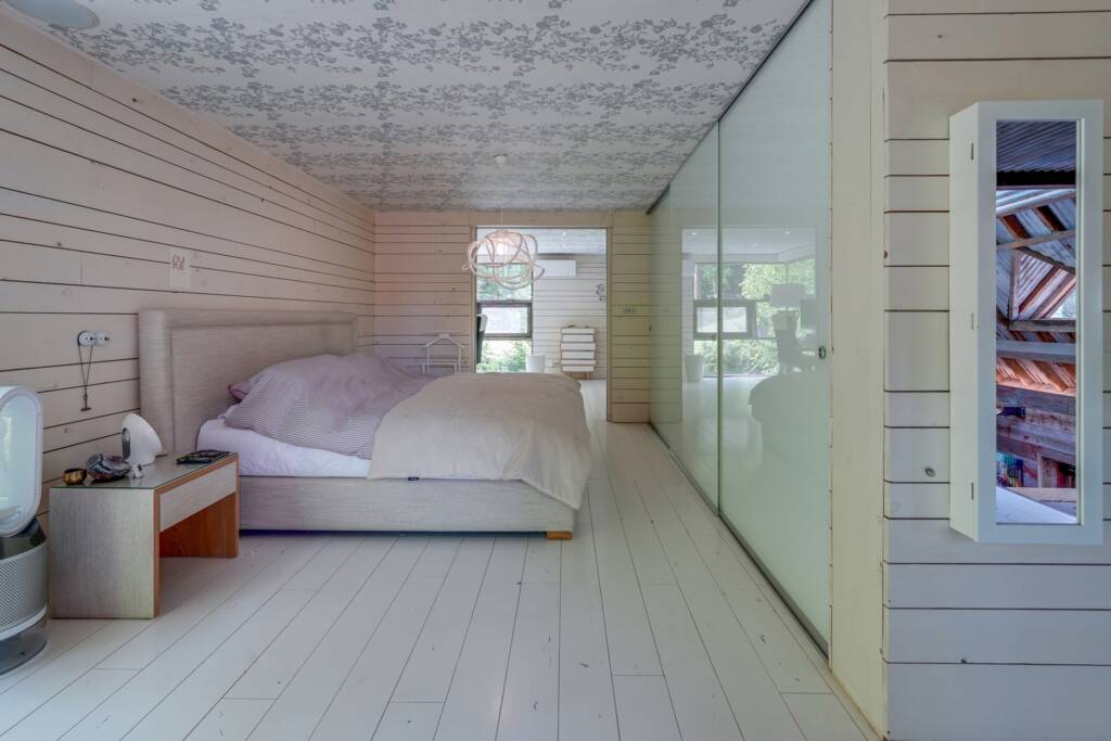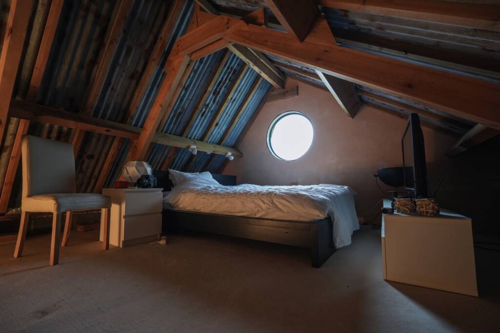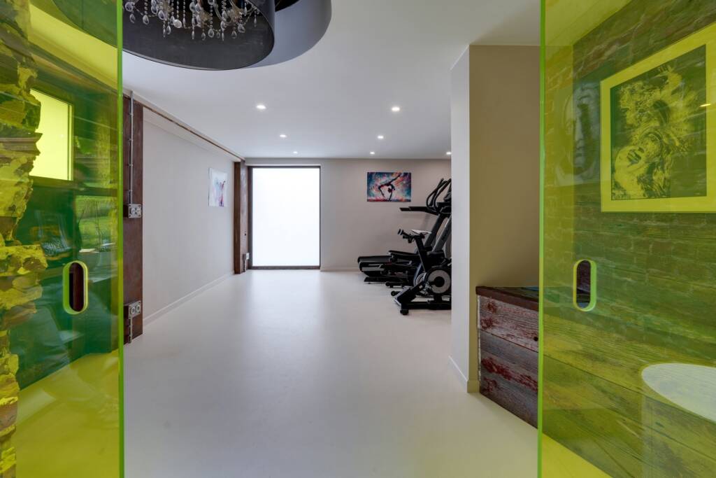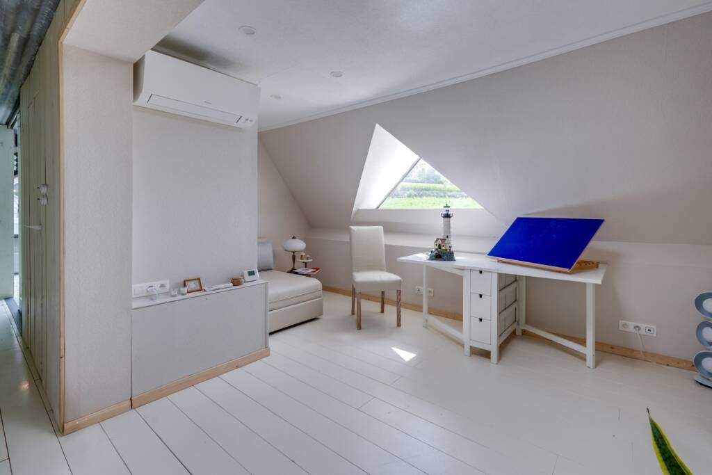 Dès l’entrée, un hall accueille les visiteurs et dessert une pièce actuellement aménagée en salle de sport. Par un escalier escamotable, on accède à un espace sous combles transformé en chambre, pratique et discret.