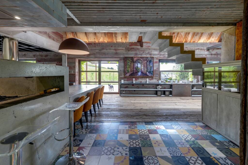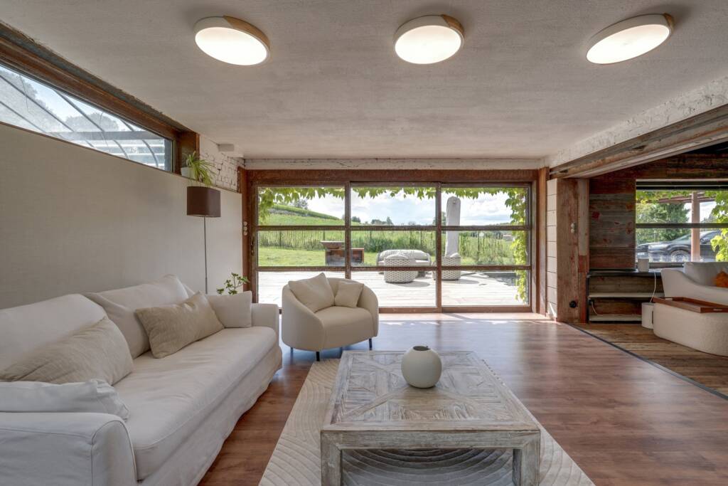 En poussant la porte coulissante, on découvre une vaste pièce de vie baignée de lumière, dans laquelle se distingue un escalier en béton brut menant à l’étage.