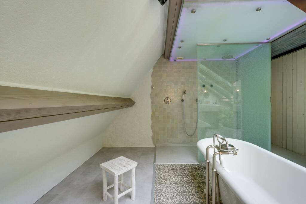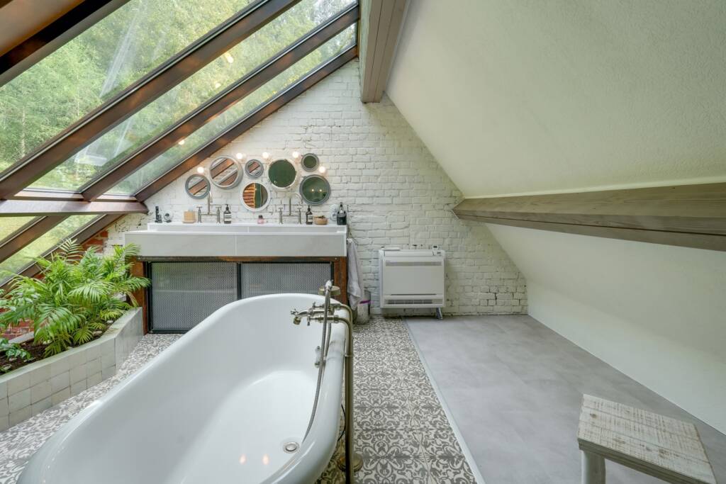 Une salle de bain lumineuse équipée d’une baignoire et d’une douche à l’italienne, ainsi qu’une toilette séparée complète l’étage.À l’extérieur, le jardin clôturé offre un cadre calme et agréable. Il comprend un abri de jardin en bois, une piscine chauffée et une petite douche, une serre et un bois privé.
