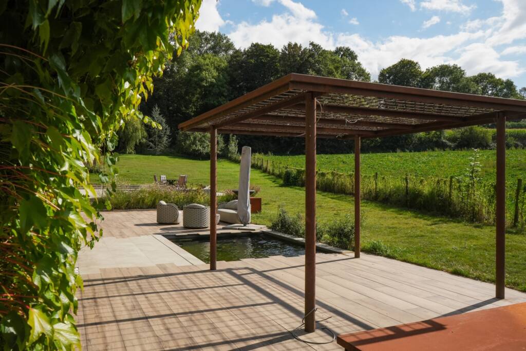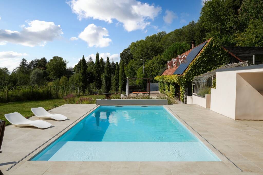 Une grande terrasse carrelée ainsi qu’un bassin d’eau complètent l’espace.