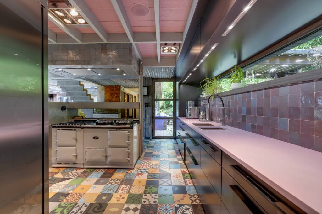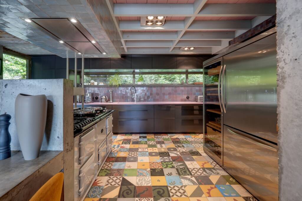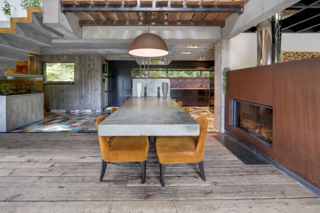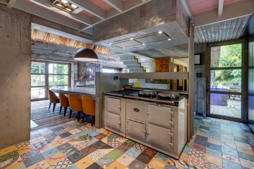 La cuisine ouverte s’intègre facilement au style de la maison avec sa grande table en béton et sa cuisinière AGA, alors qu’entre le salon et la cuisine se trouve un poêle à bois qui séparée les deux pièces.