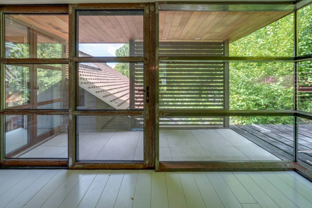 Dans le prolongement du salon, un second espace salon s’ouvre largement sur l’extérieur, offrant une vue imprenable sur la piscine.À l’étage, on arrive sur une mezzanine lumineuse avec une grande ouverture donnant un accès direct vers l’extérieur.