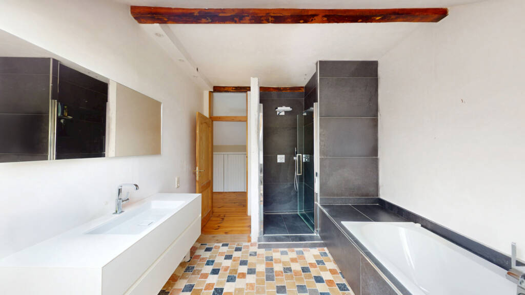 • Chambre parentale de +/- 28,5 m² avec dressing et salle de bain attenante de +/- 12m² comprenant une douche, une baignoire, un wc et un meuble lavabo double vasque.