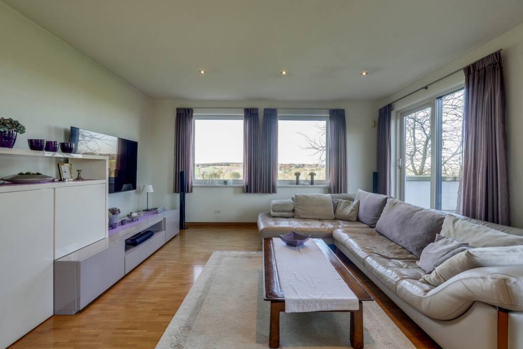 Organisée autour d’un atrium central baigné de lumière, cette villa de +/- 350 mètres carrés se compose de demi-niveaux qui apportent volume et fluidité aux espaces. Le hall d’entrée en marbre mène vers un bureau ainsi que vers de superbes pièces de réception : un salon raffiné avec feu ouvert et bibliothèque sur mesure, une salle à manger élégante, et une cuisine haut de gamme avec îlot central et coin à déjeuner, prolongée par l’une des terrasses offrant une vue apaisante sur le jardin.
