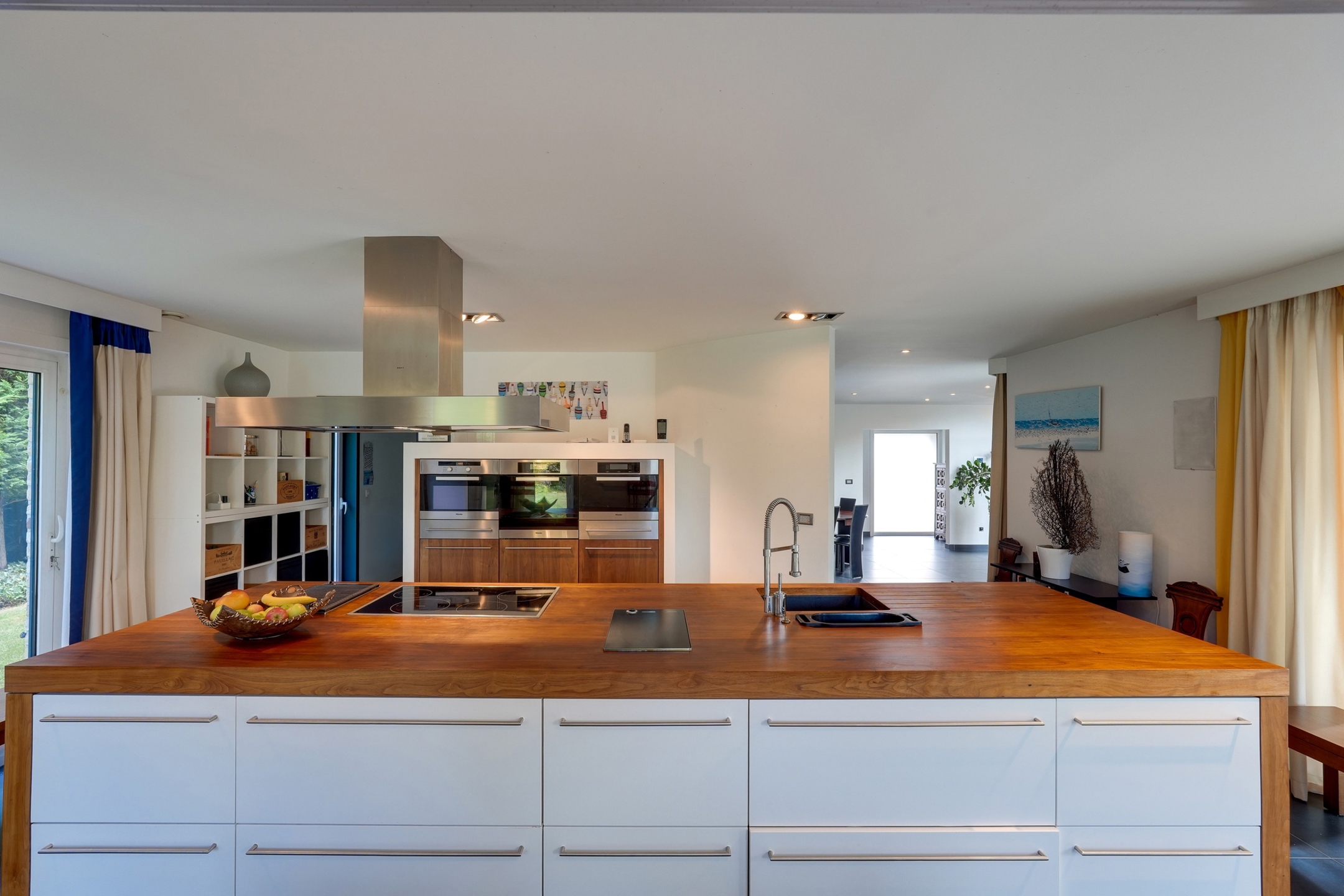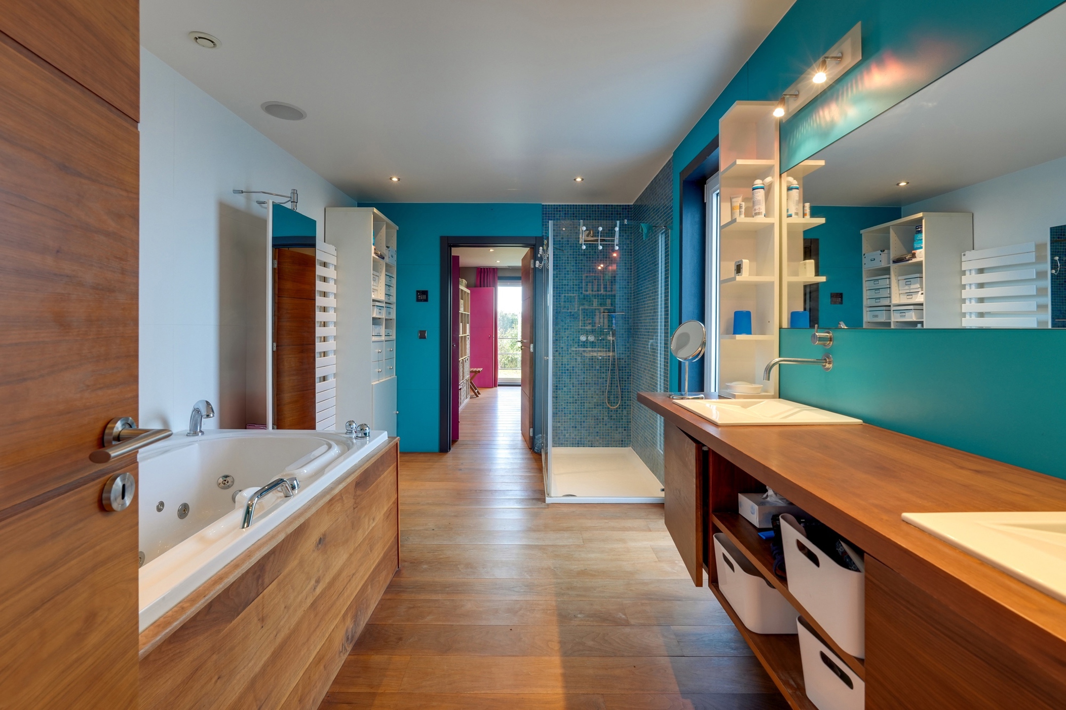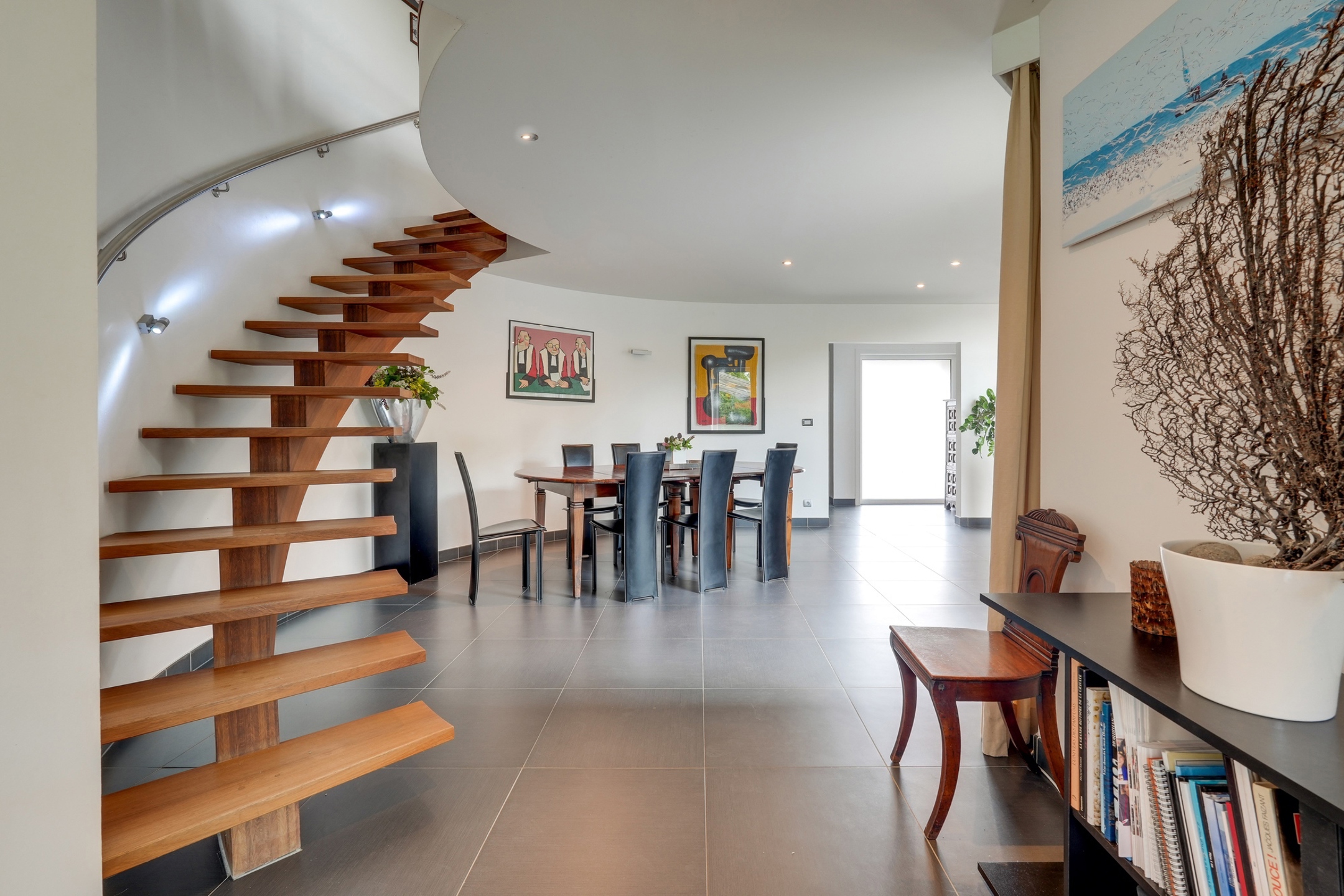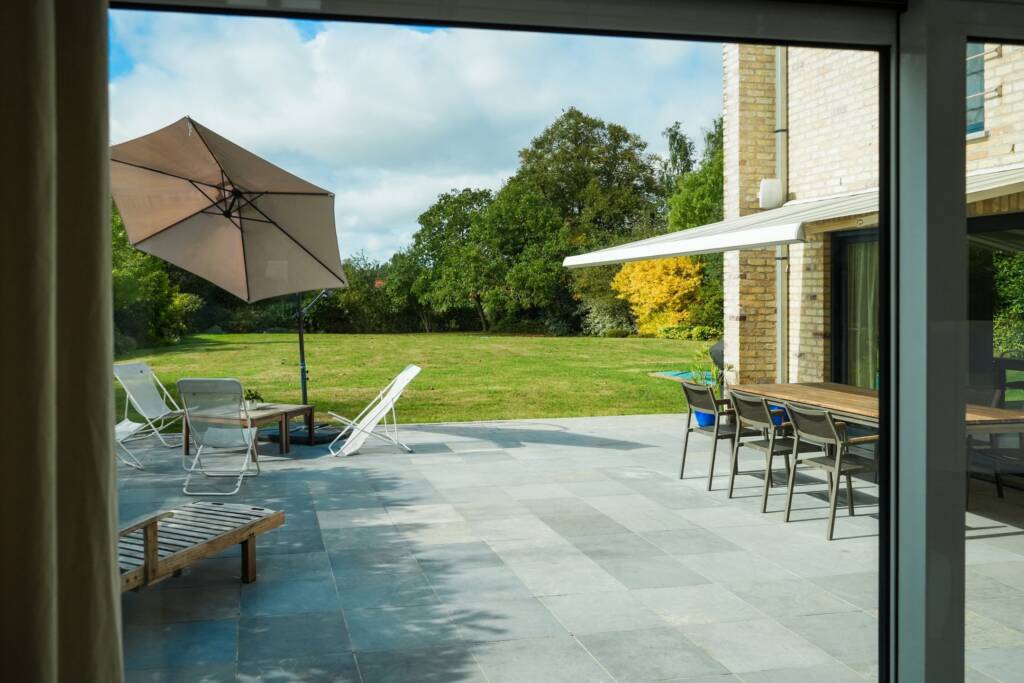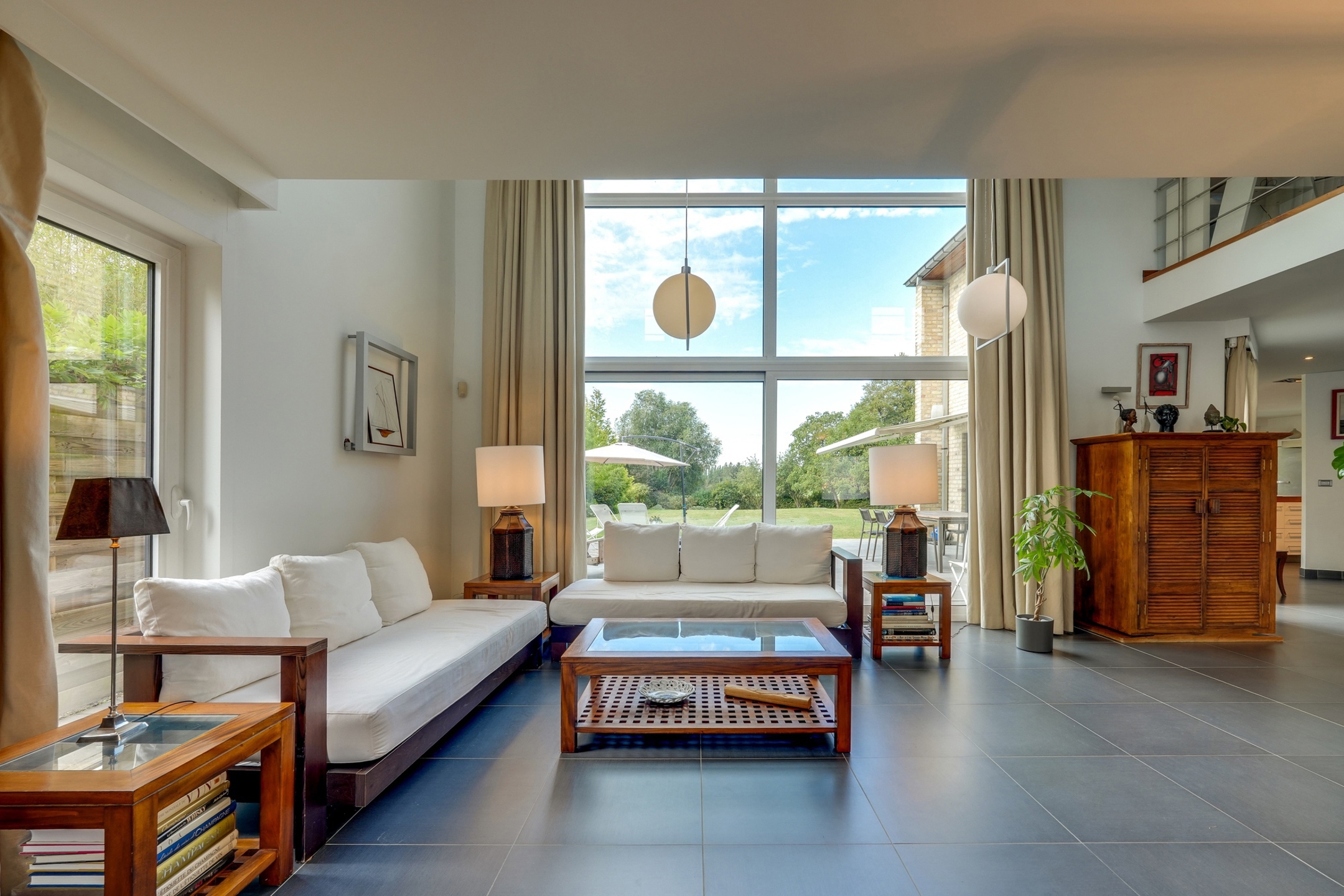 Chauffage au sol par pompe à chaleur avec forage au rez-de-chaussée et système d’air pulsé à l’étage, châssis en aluminium double vitrage, VMC double flux, système HiFi intégré, alarme, parquet massif.
