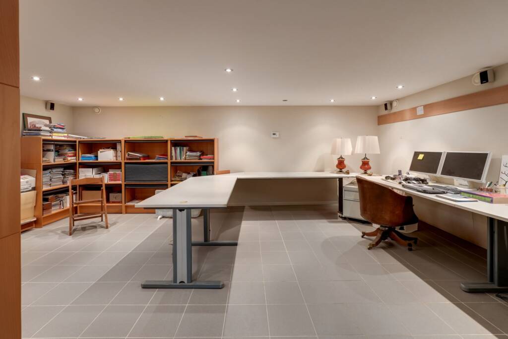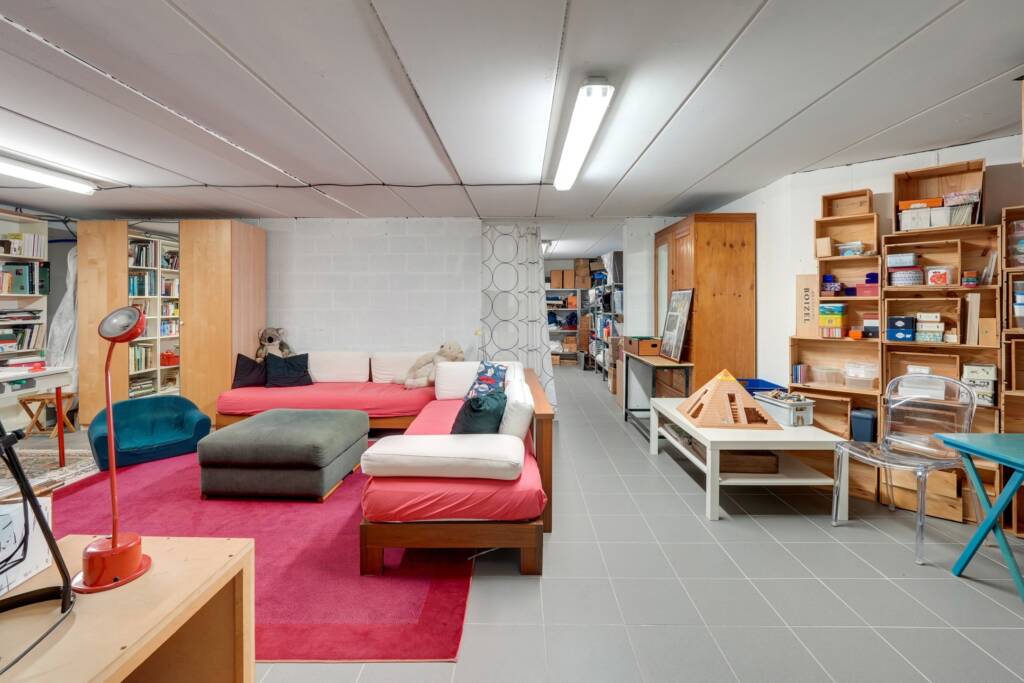 La maison est entièrement excavée et propose de beaux espaces fonctionnels : vaste pièce de rangement, salle de jeux, bureau, cave, cave à vin et chaufferie.