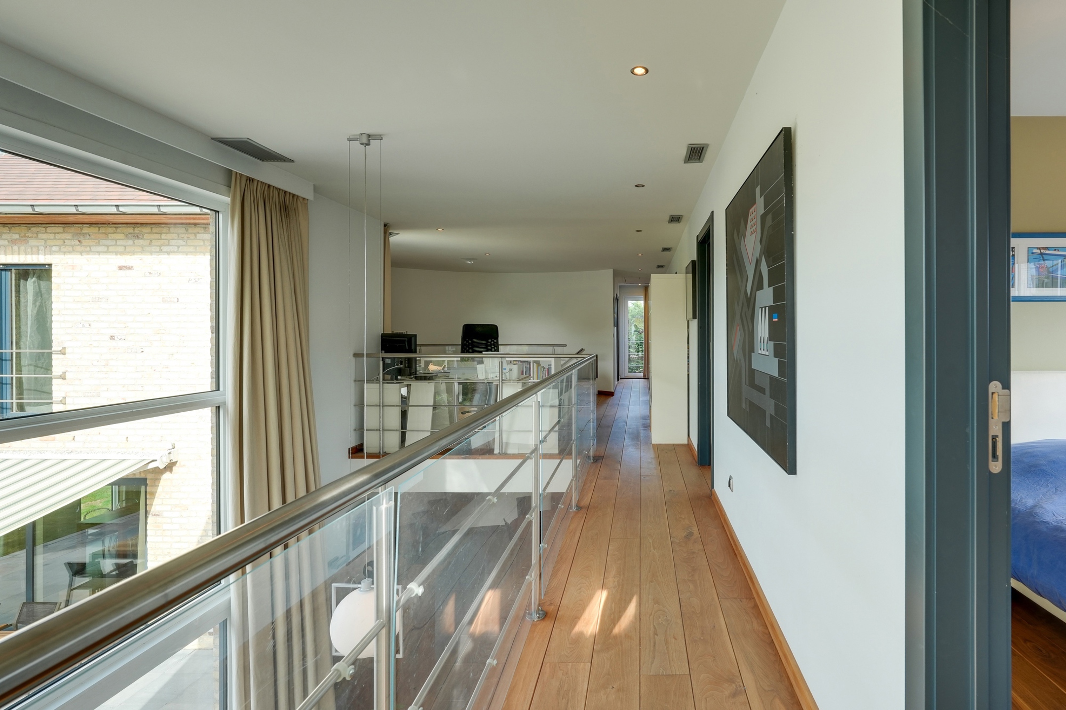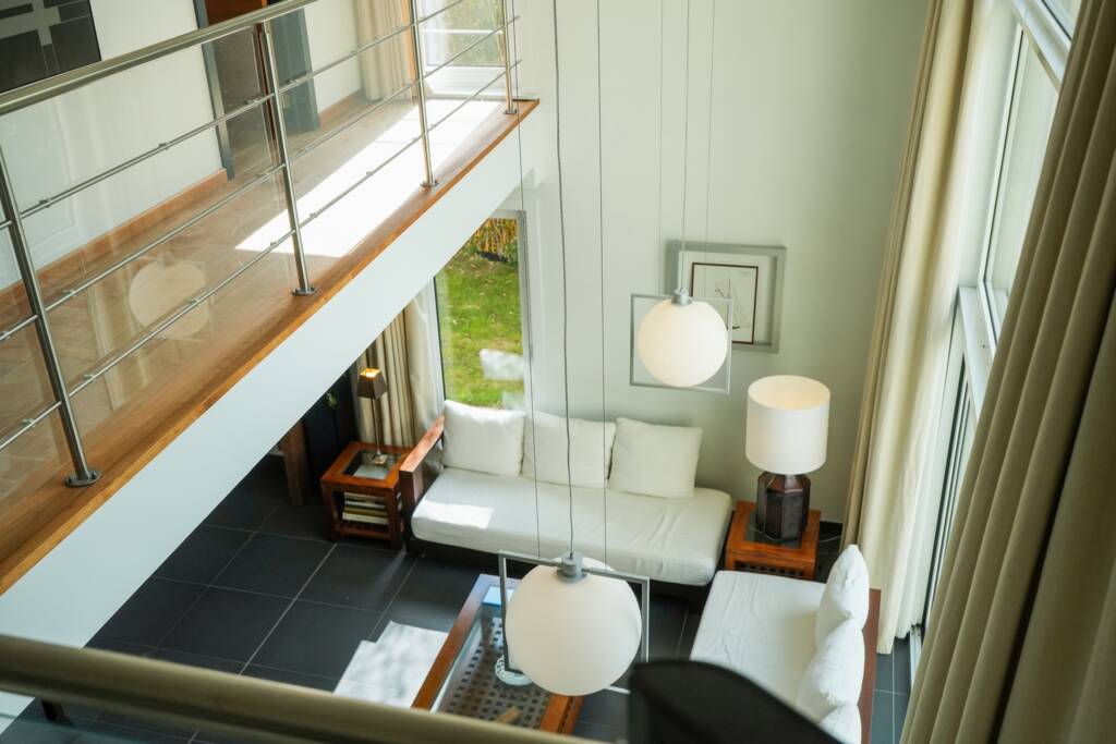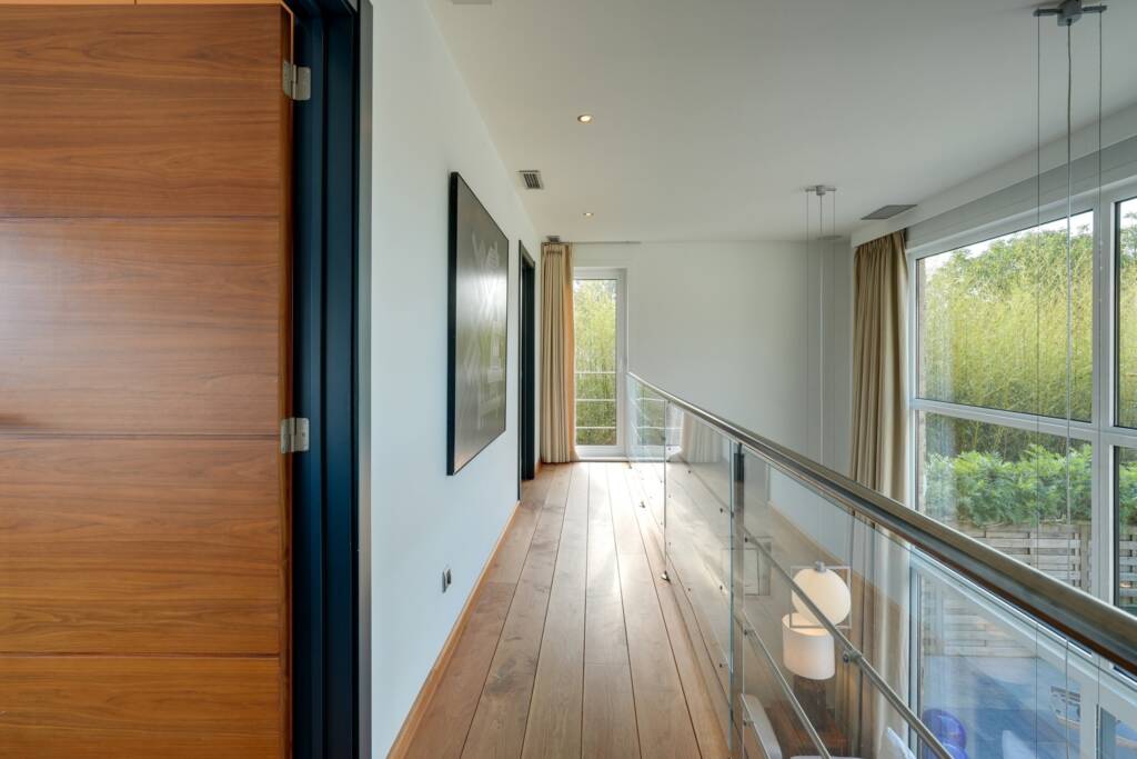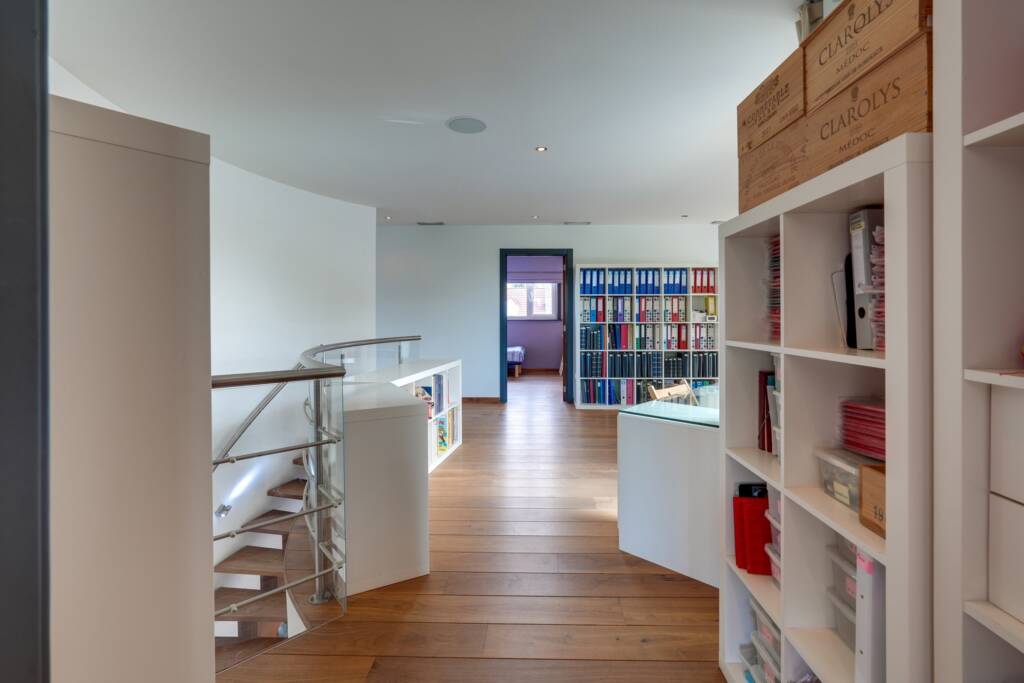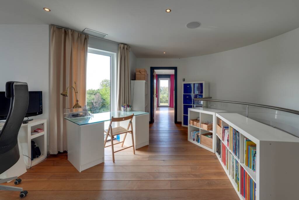 Un spacieux hall de nuit, offrant une vue plongeante sur la pièce de vie, dessert une élégante suite parentale avec chambre, dressing et salle de bains privative. Trois chambres supplémentaires ainsi qu’une seconde salle de bains complètent l’espace nuit. Une pièce polyvalente, actuellement aménagée en bureau, se situe au-dessus du garage.