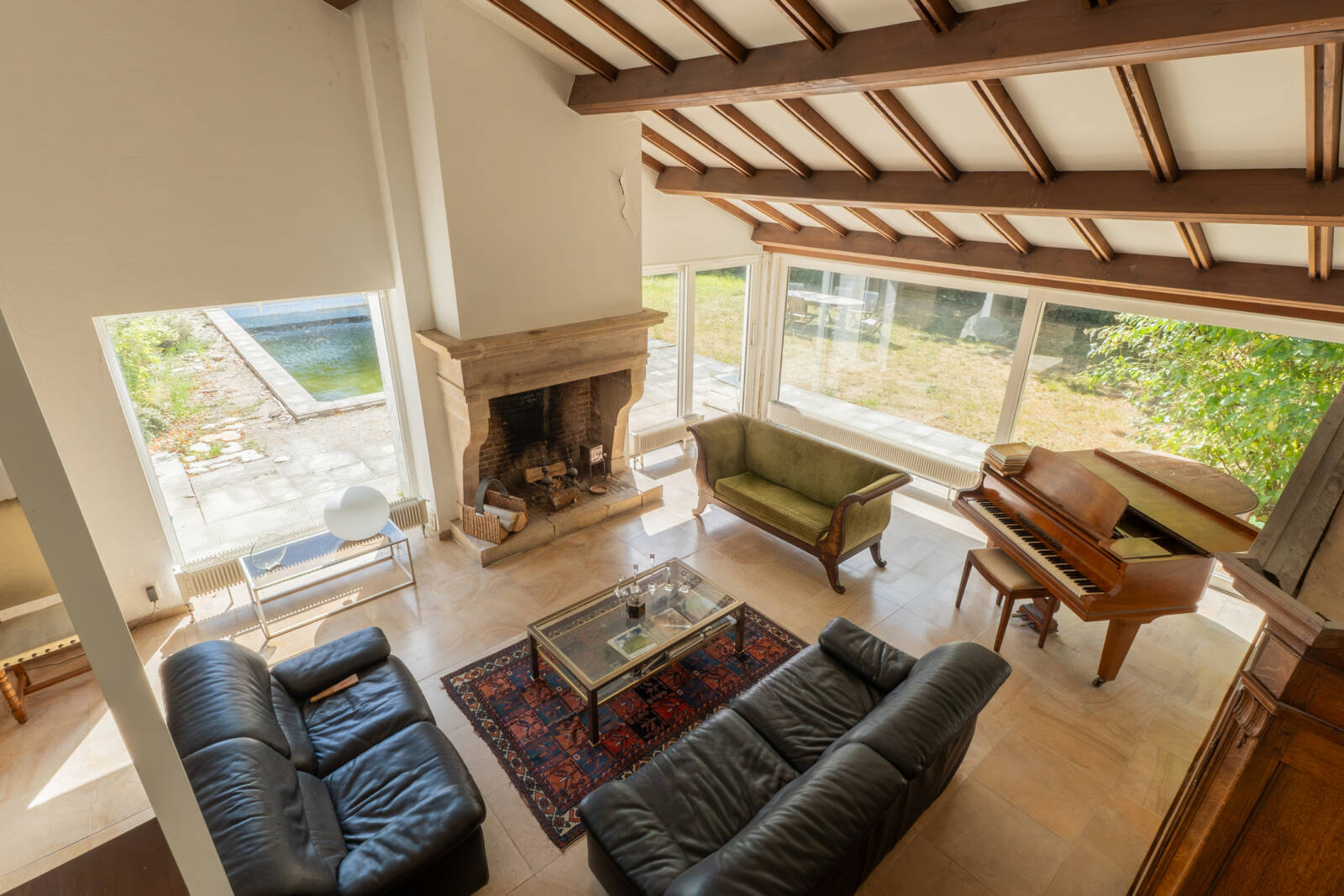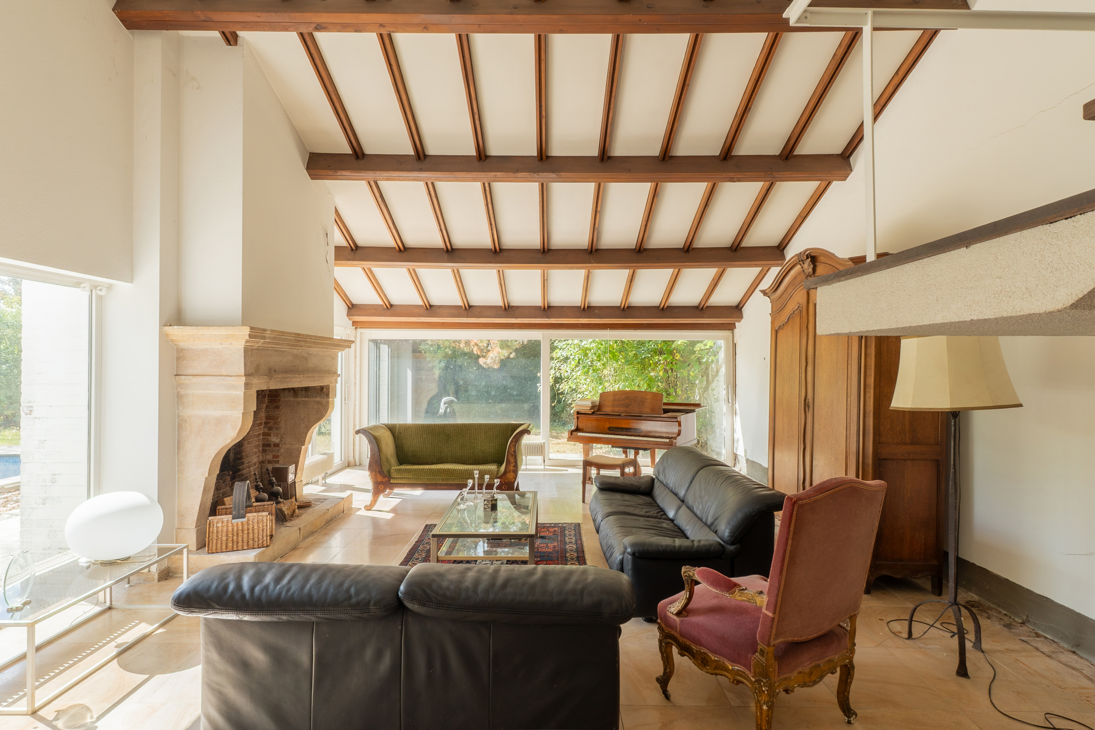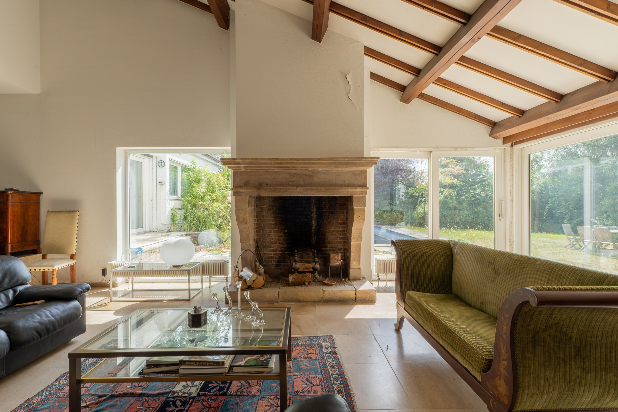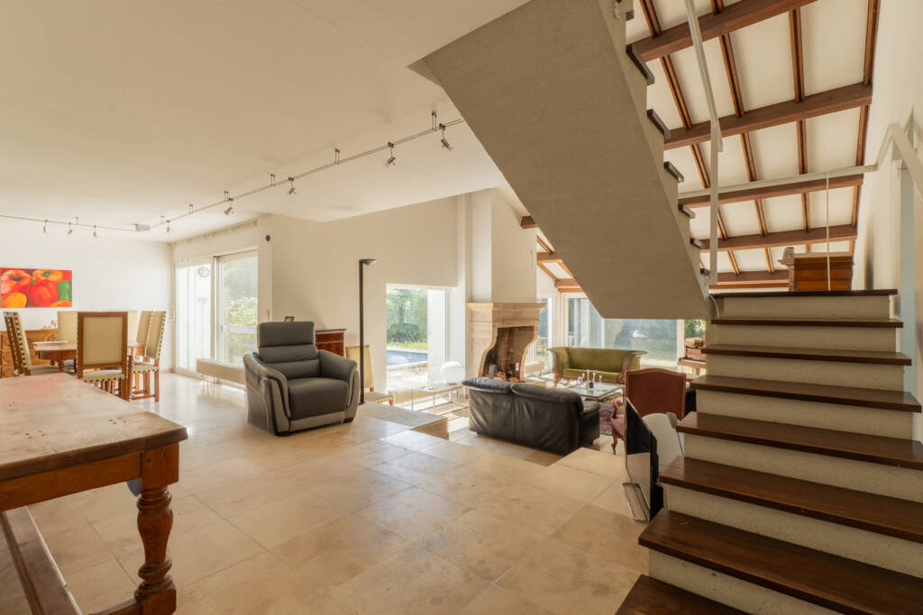 Le rez-de-chaussée propose un hall d’entrée avec espace vestiaire et WC invités avec lave-mains, un séjour lumineux de 81 m² agrémenté d’un feu ouvert en pierre de France, une vaste cuisine équipée attenante, une buanderie, un grand garage pour 2 voitures et une cave saine.