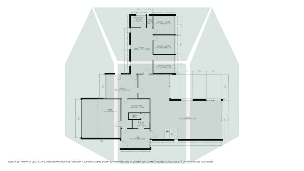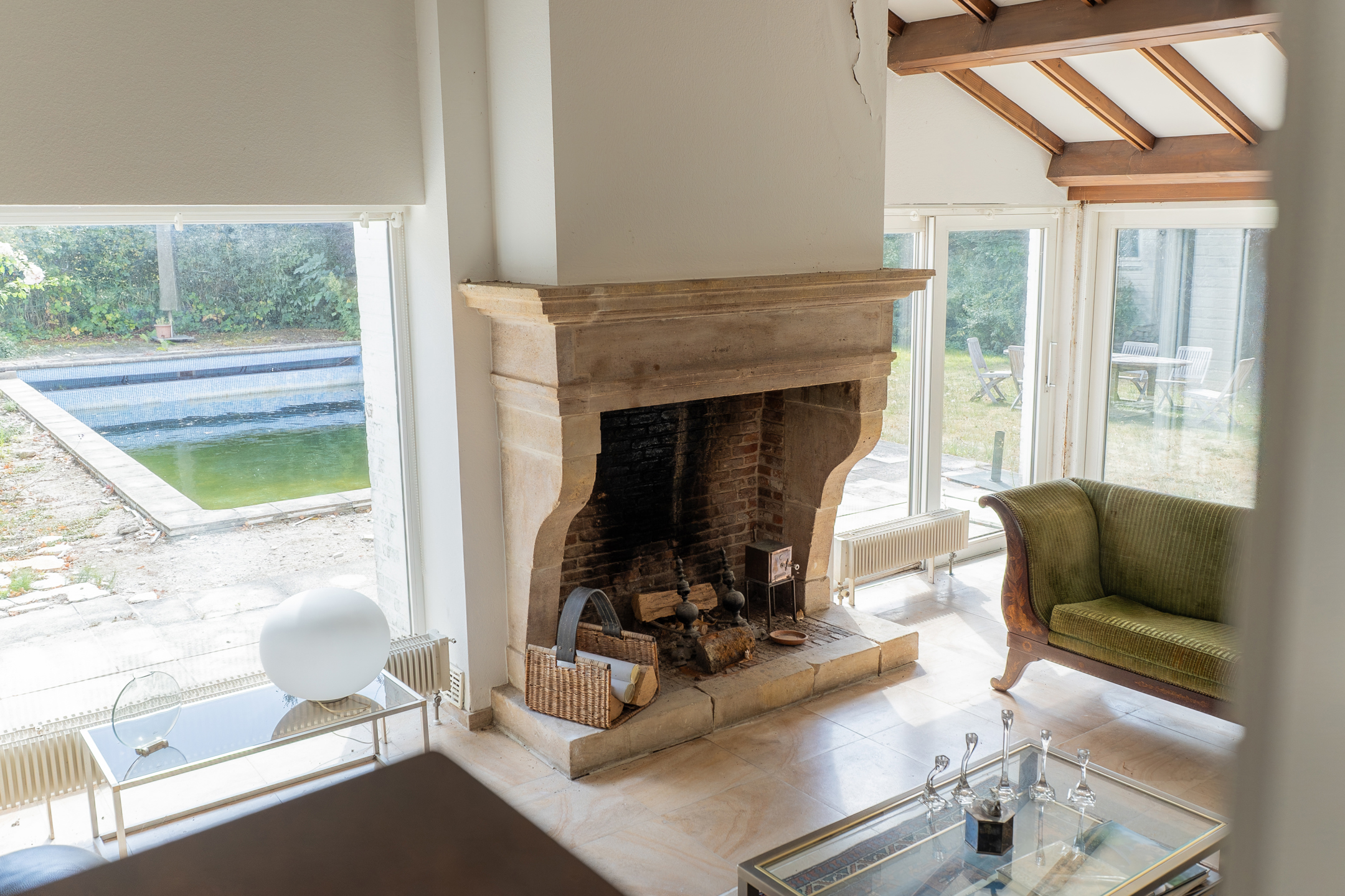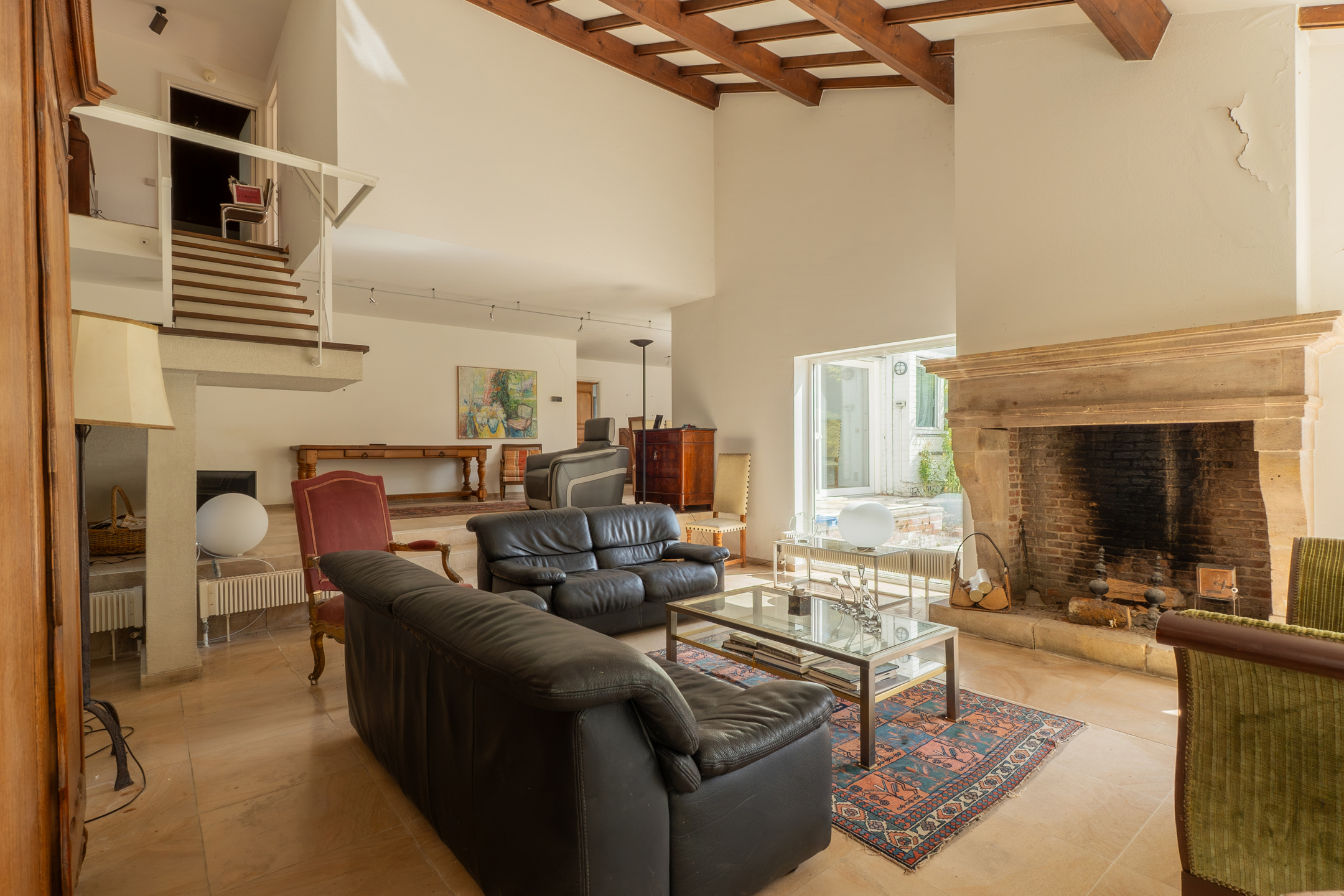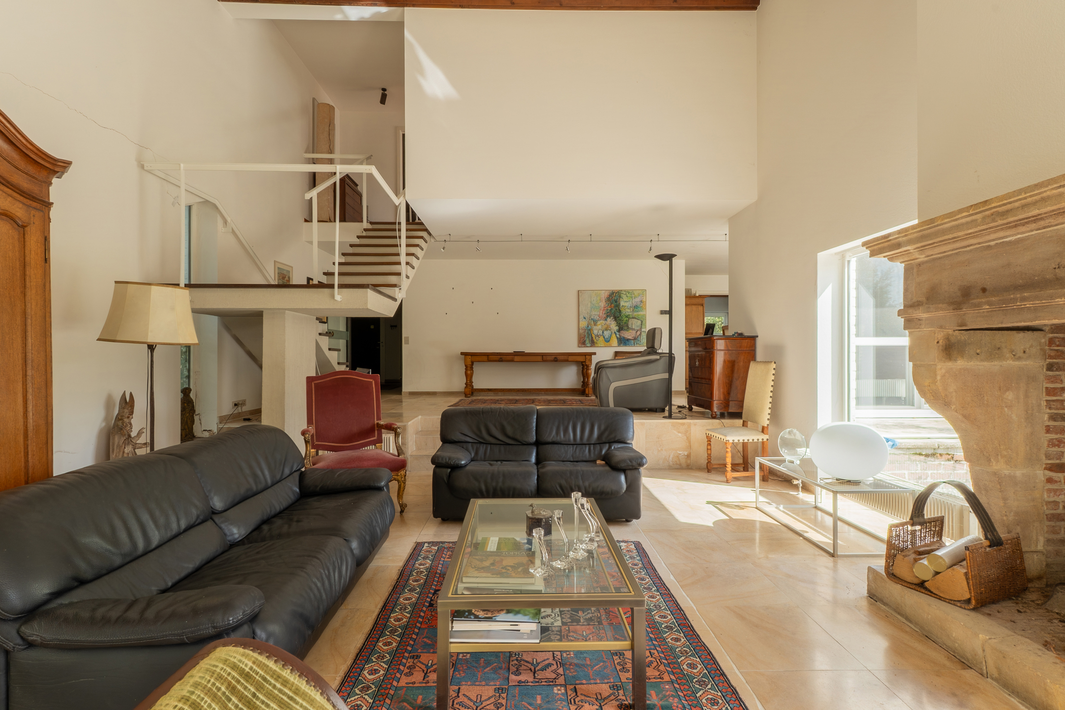 Le rez-de-chaussée propose un hall d’entrée avec espace vestiaire et WC invités avec lave-mains, un séjour lumineux de 81 m² agrémenté d’un feu ouvert en pierre de France, une vaste cuisine équipée attenante, une buanderie, un grand garage pour 2 voitures et une cave saine.