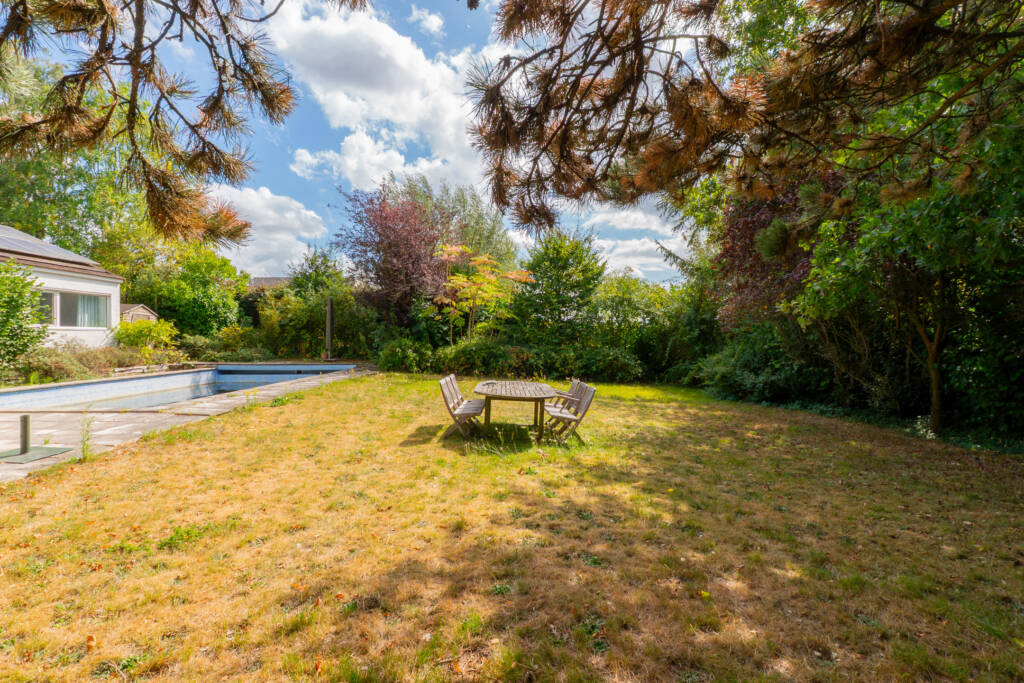 L’extérieur offre une parcelle de 1.464 m², une terrasse carrelée, un jardin arboré exposé sud-ouest, une piscine, des places de parking privées et un passage latéral.