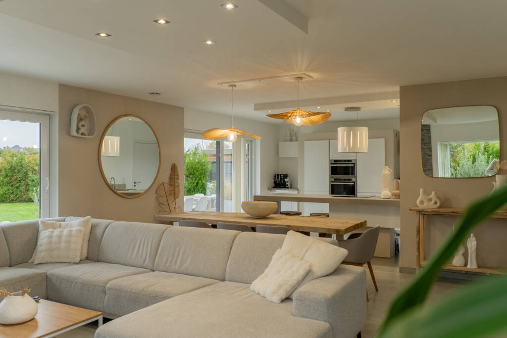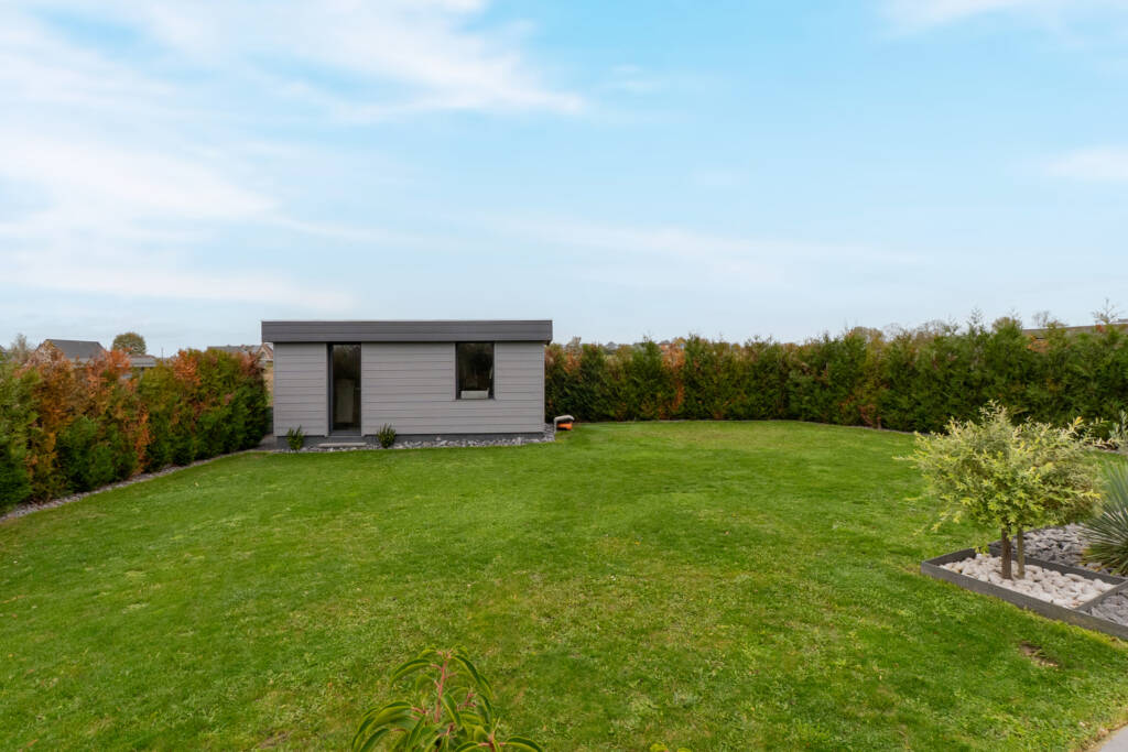 Dès l’entrée, un bel hall avec escalier apparent donne le ton : volumes, lumière et finitions haut de gamme. Le rez-de-chaussée offre un bureau ou chambre d’appoint, un WC suspendu, et une spacieuse pièce de vie ouverte regroupant salon, salle à manger et cuisine équipée bénéficiant d’une superbe vue sur le jardin. S’ajoutent un garage une voiture avec espace chaufferie et buanderie.