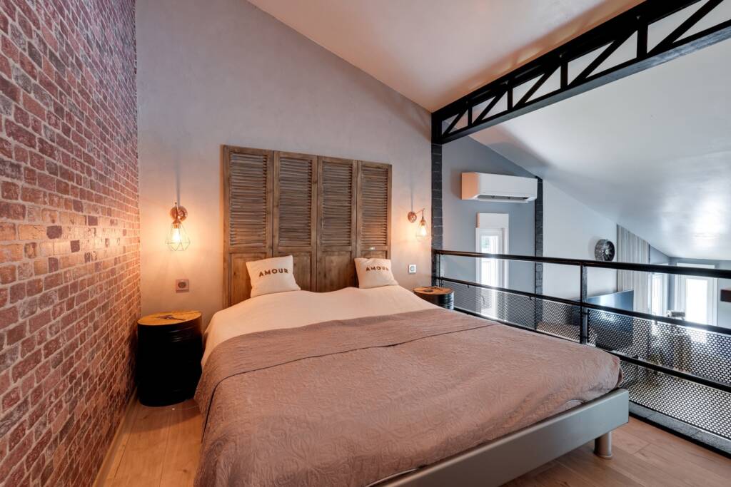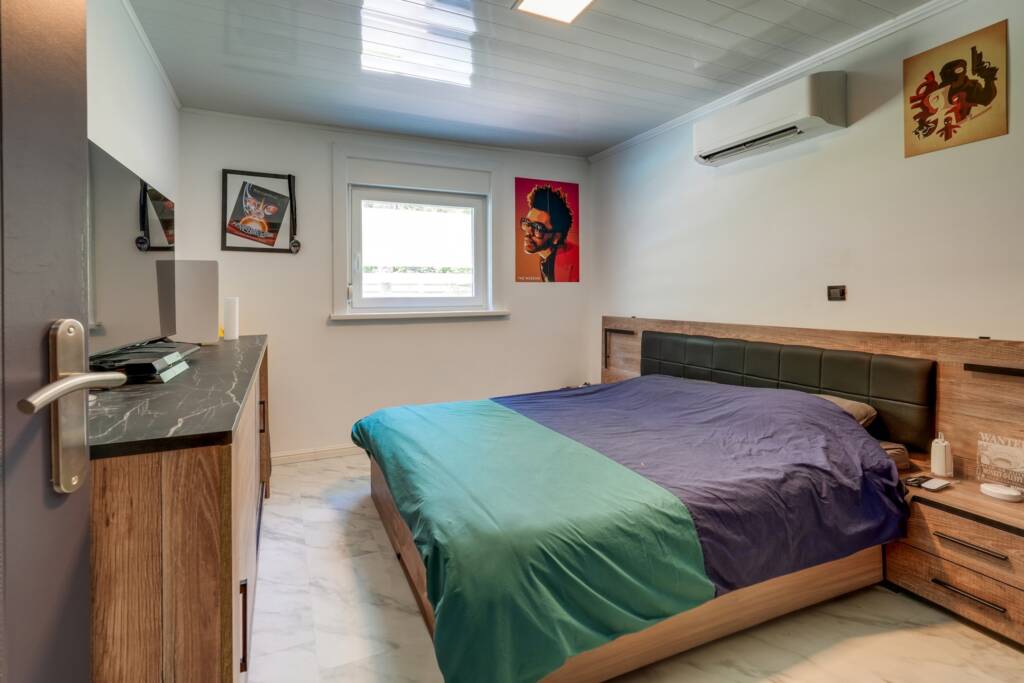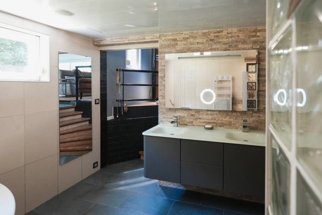 La maison dispose de quatre chambres : trois situées au rez-de-chaussée et une chambre supplémentaire à l’étage, aménagée avec climatisation et un dressing attenant de 12 m². La suite parentale d’environ 24 m² bénéficie d’une salle de bains privative avec baignoire d’angle, douche à l’italienne, double lavabo, sèche-serviettes et WC séparé. Une deuxième salle de bains, située sous la suite parentale, comprend une douche à l’italienne, un double lavabo et un sèche-serviettes.