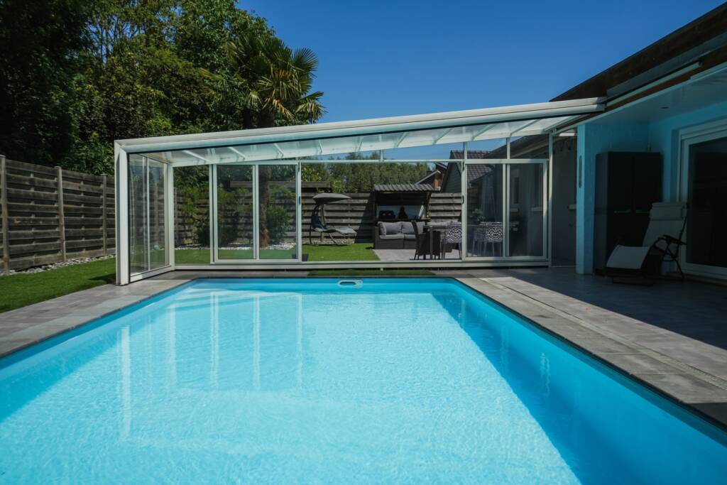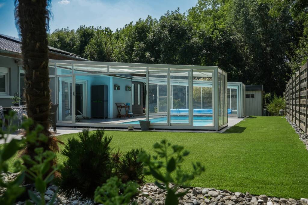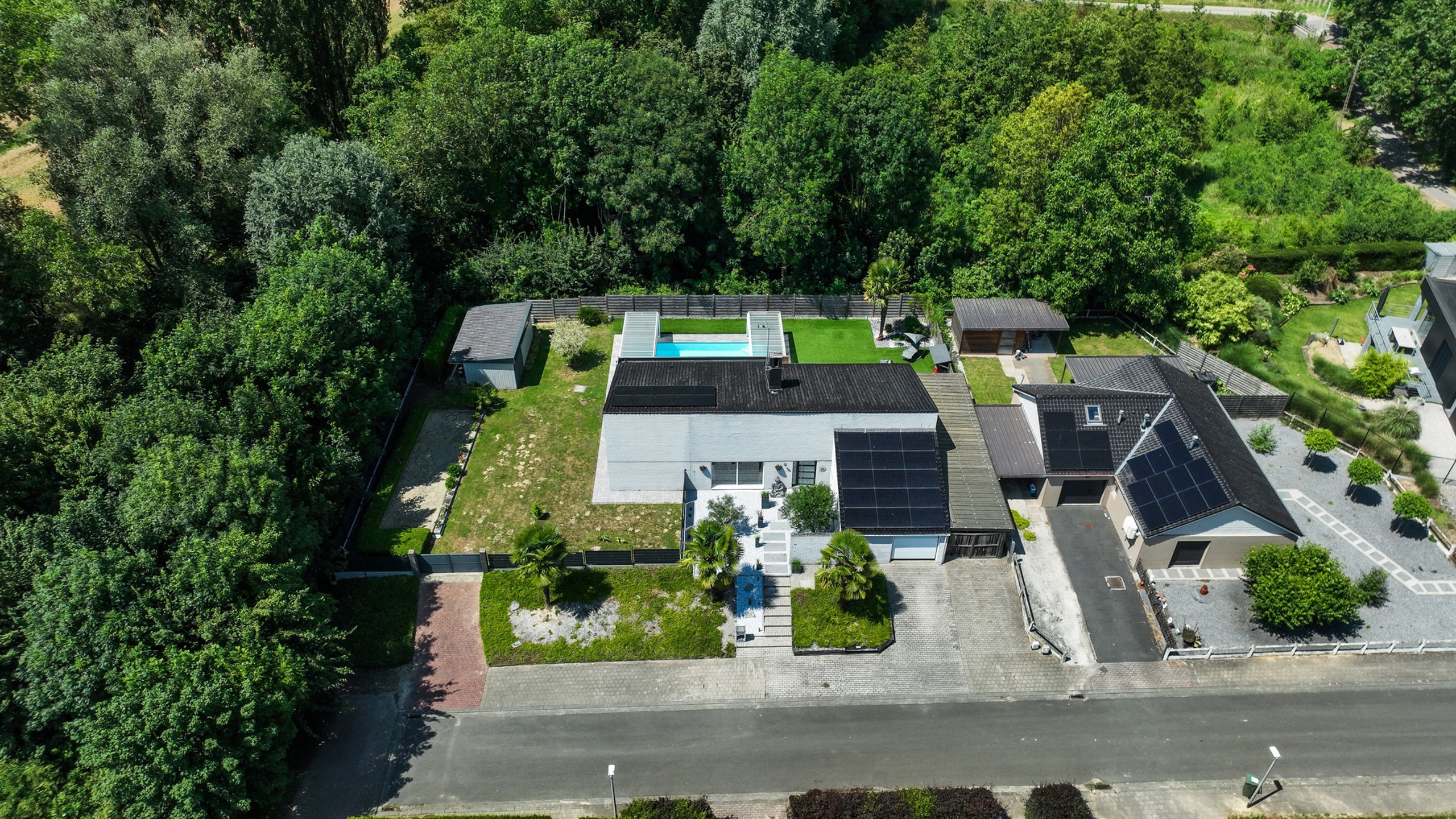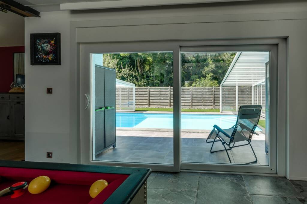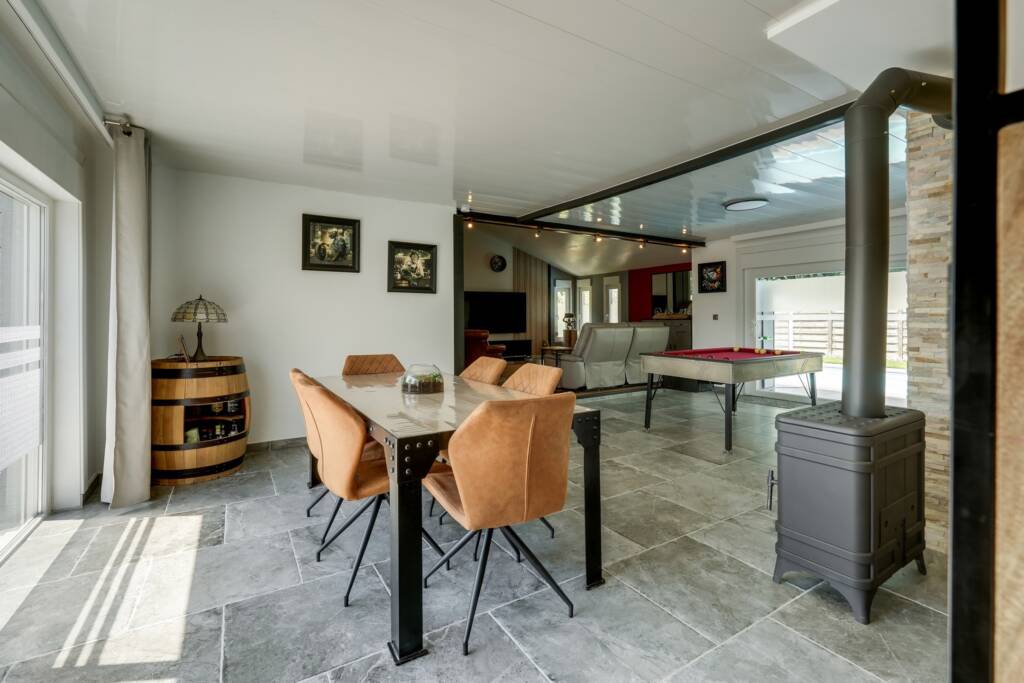 À l’extérieur, vous profitez d’une agréable terrasse ensoleillée et d’une piscine chauffée et couverte, pouvant s’ouvrir lors des beaux jours. Le jardin, soigneusement aménagé, s’étend jusqu’à une zone boisée paisible. Une remise avec espace barbecue couvert, un carport pour trois voitures, un emplacement de parking pour deux véhicules à l’avant et un portail automatique complètent les équipements.