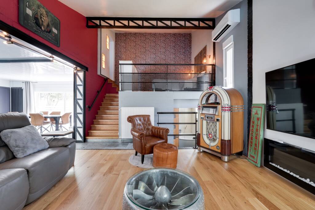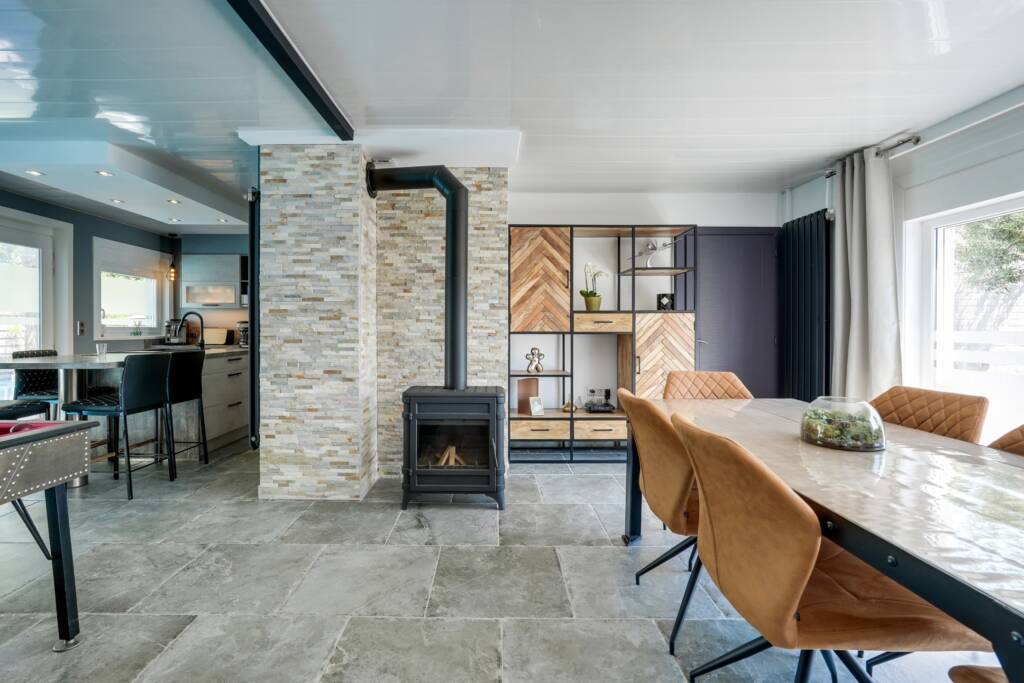 Dès l’entrée, vous êtes accueilli par un hall lumineux avec vestiaire et toilette invités. Sur la gauche, un vaste séjour avec poêle à bois vous invite à la détente, comprenant un agréable coin salon, en liaison directe avec une cuisine ouverte entièrement équipée : îlot central, électroménagers de qualité de la marque SMEG, coin repas et nombreux rangements.Depuis le hall, vous accédez directement à un garage spacieux d’environ 30 m², muni d’une porte sectionnelle motorisée, d’un local technique et d’un accès au grenier (espace de rangement).
