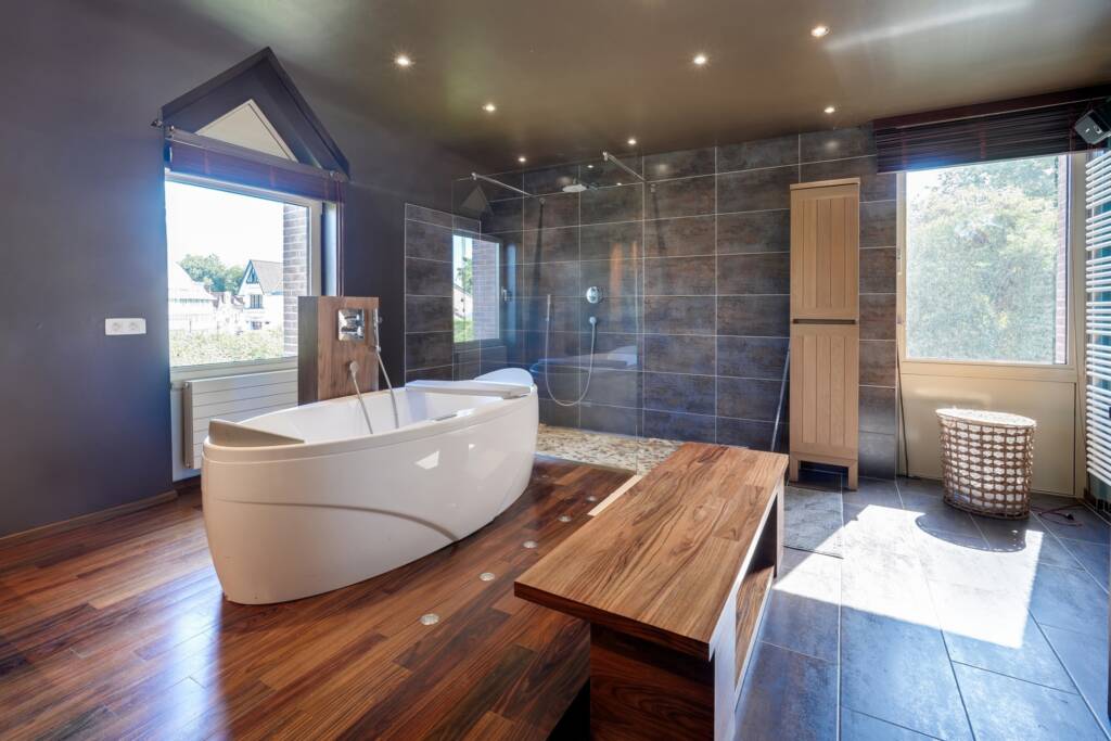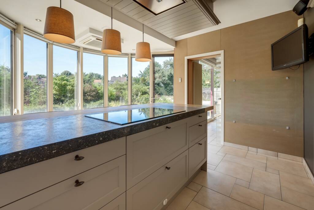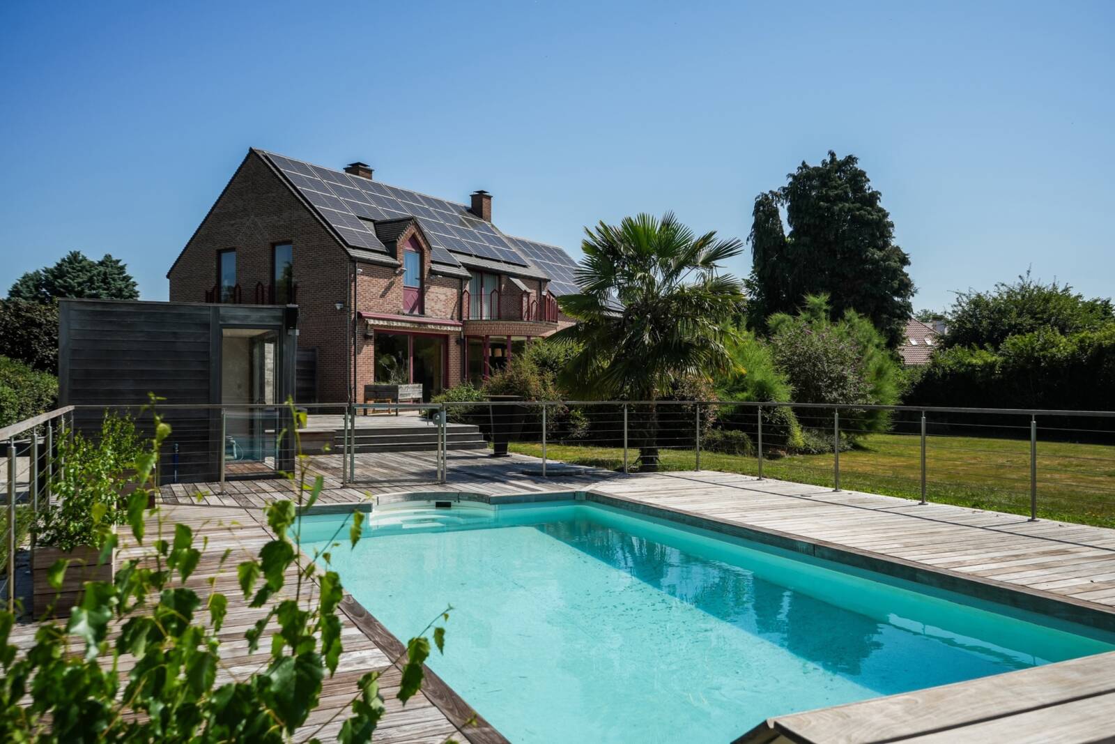 Caractéristiques : 50 panneaux photovoltaïques, chauffage central au mazout, climatisation, châssis en aluminium double vitrage, citerne d’eau de pluie, borne de recharge pour véhicule électrique, alarme, caméras, hifi Bose.