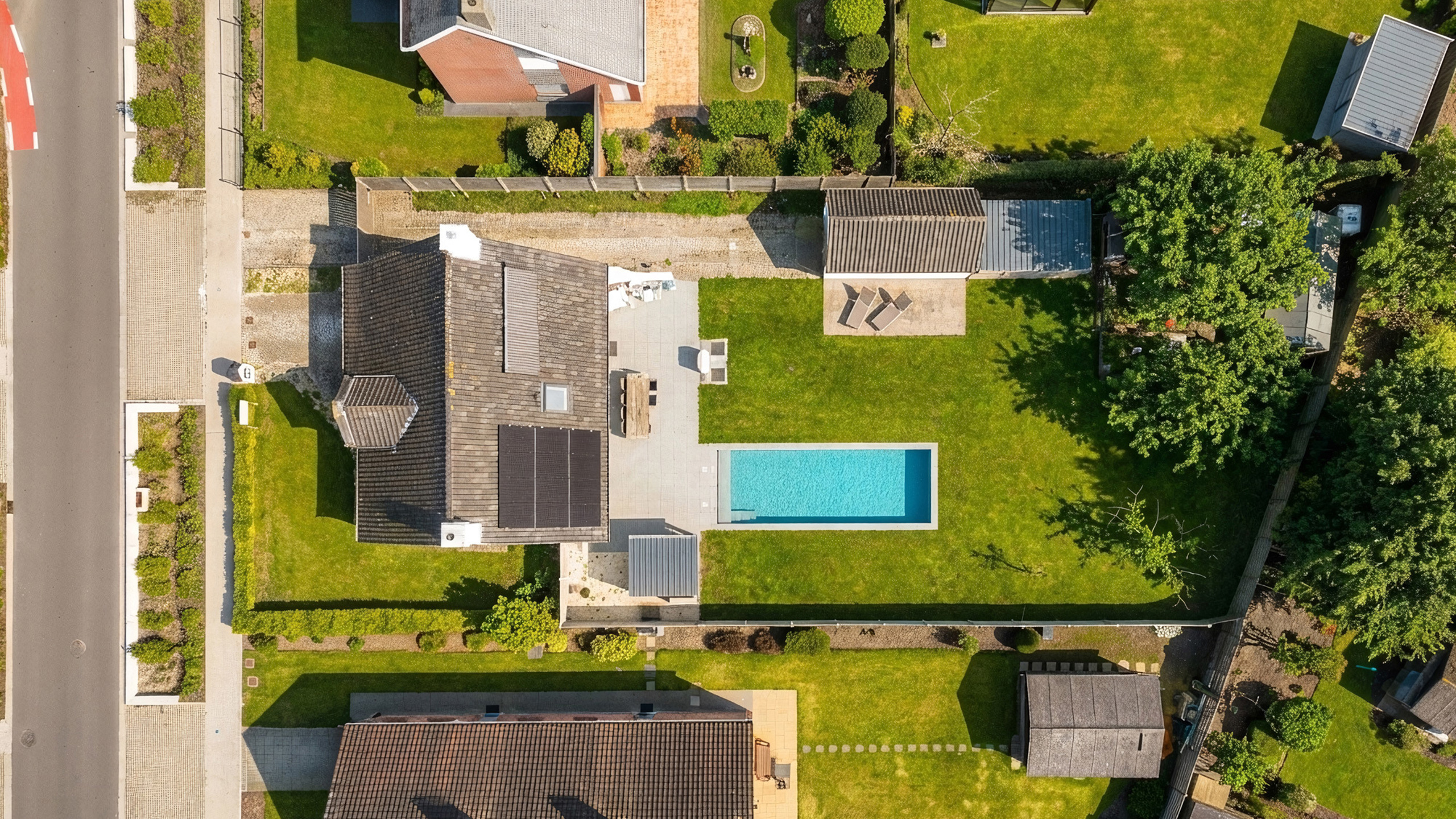 Au rez-de-chaussée, vous découvrirez un hall d’entrée donnant accès à un bureau séparé et à des toilettes indépendantes. Le séjour lumineux est doté d’une agréable cheminée au gaz et offre une vue sur le jardin orienté plein sud avec piscine, équipée d’un volet automatique, d’un éclairage et chauffée par une pompe à chaleur. La cuisine entièrement équipée dispose d’un élégant plan de travail en granit et communique avec le garage à porte automatique, où se trouvent également 2 panneaux solaires et 3 batteries domestiques. À l’extérieur, vous profiterez de deux terrasses carrelées et d’un jardin entièrement clôturé en bois, idéal pour la détente et l’intimité.