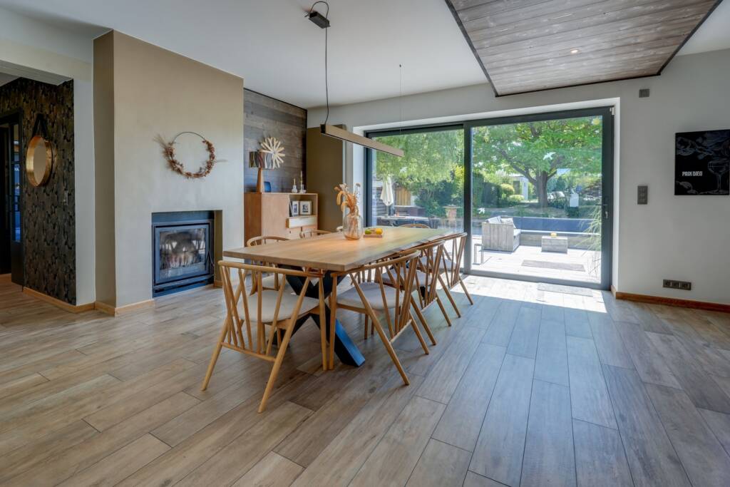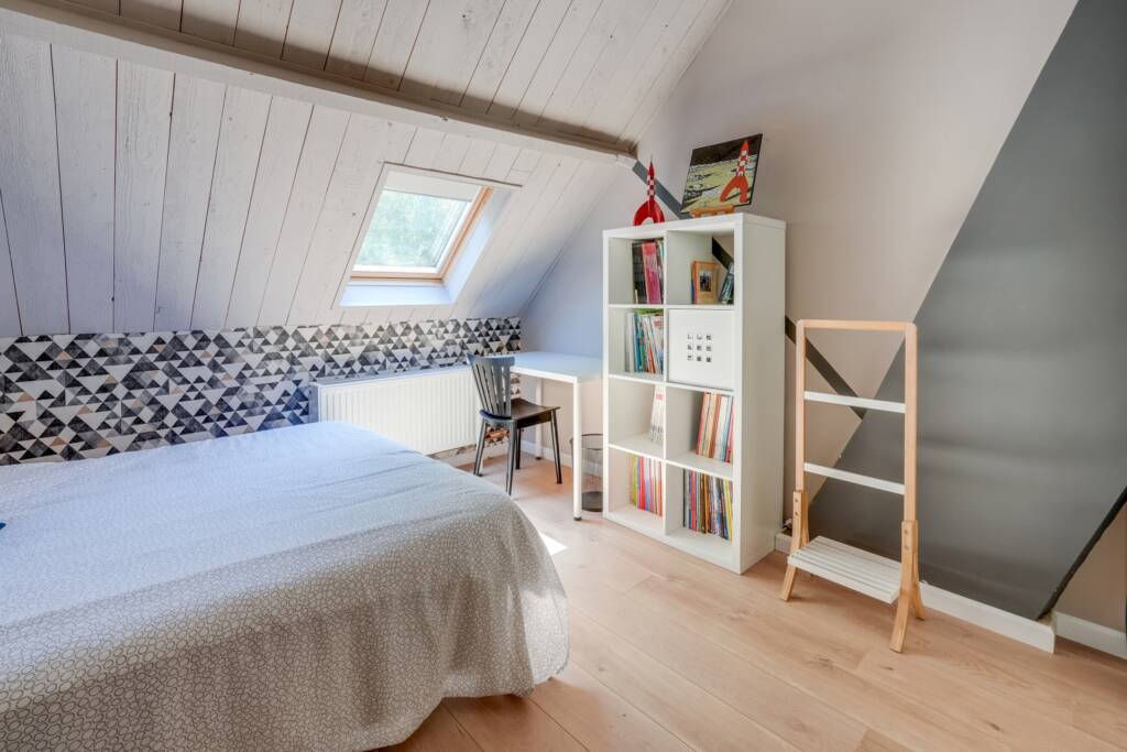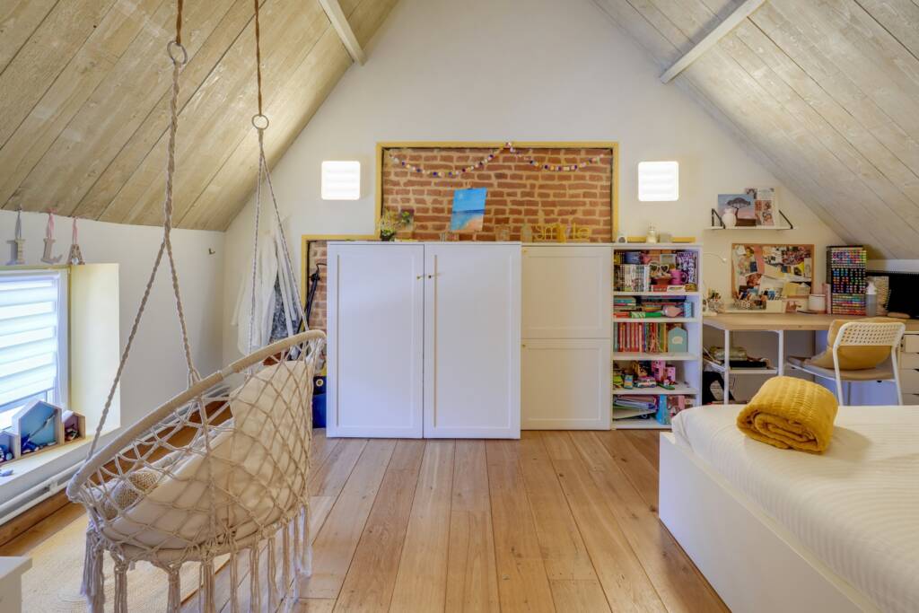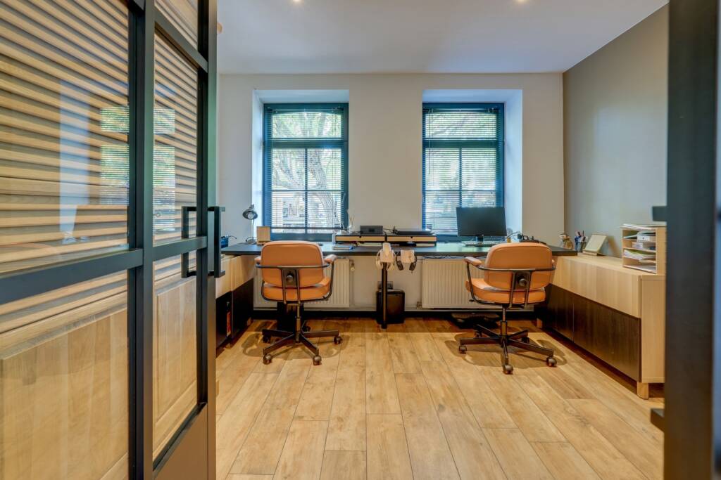 De woning beschikt over een inkomhal, een ruime leefruimte van 45 m² met zicht op de tuin, een volledig uitgeruste keuken, een bureau, vijf slaapkamers en twee badkamers.