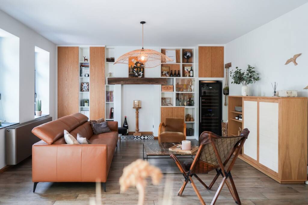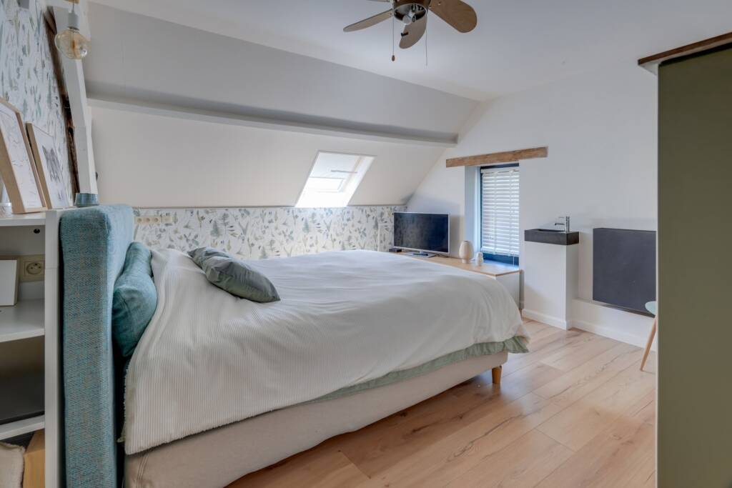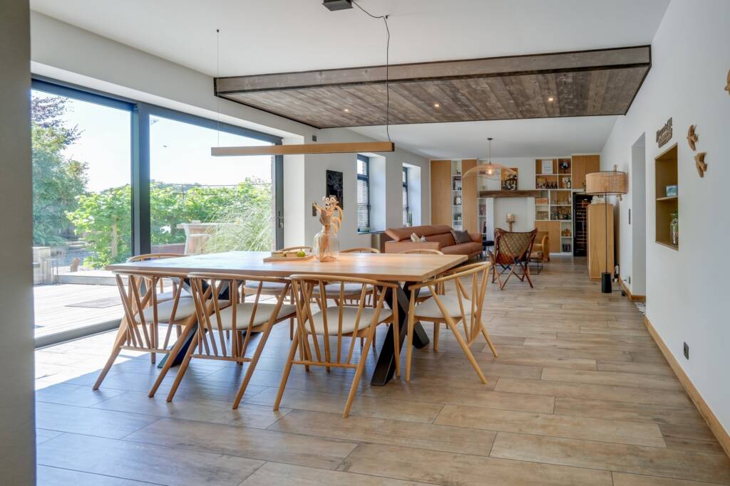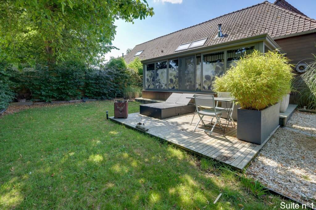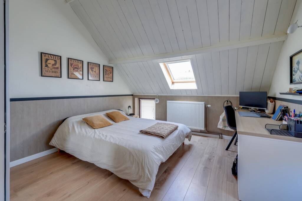 De woning beschikt over een inkomhal, een ruime leefruimte van 45 m² met zicht op de tuin, een volledig uitgeruste keuken, een bureau, vijf slaapkamers en twee badkamers.