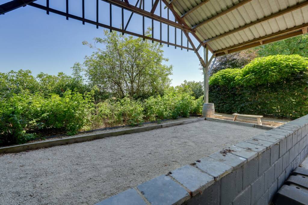Een ruime overdekte loods van 200 m² vervolledigt het geheel: uitgerust met 42 zonnepanelen, biedt hij opslagruimte, een speelzone, een petanqueterrein en in de nabijheid een parking voor zes voertuigen.