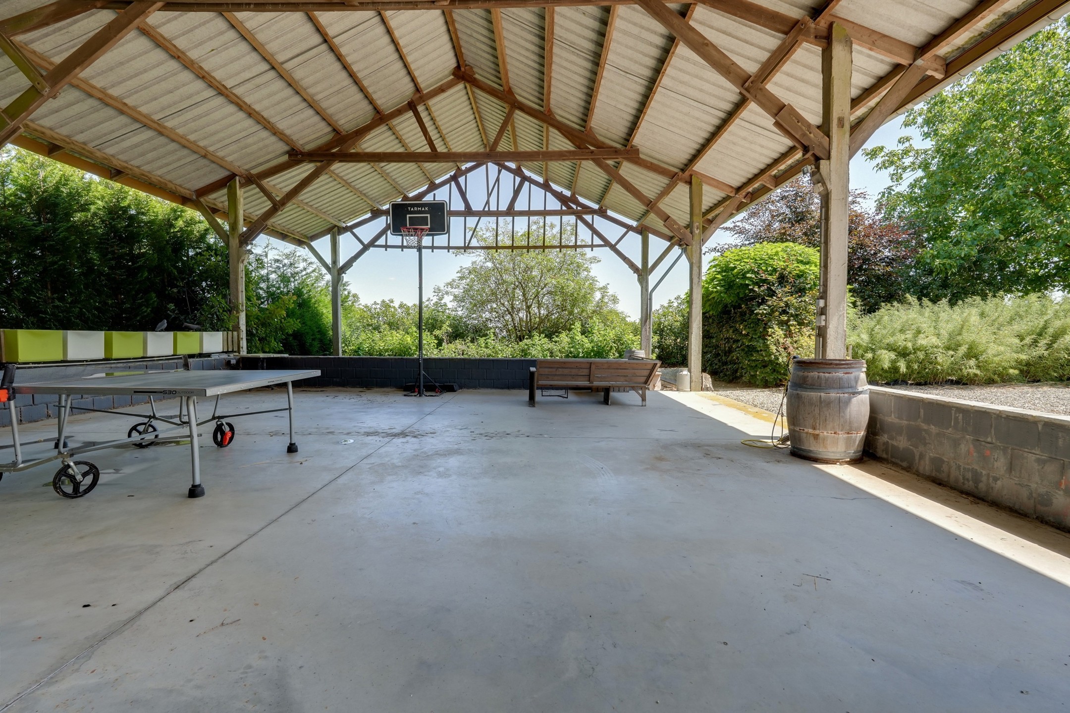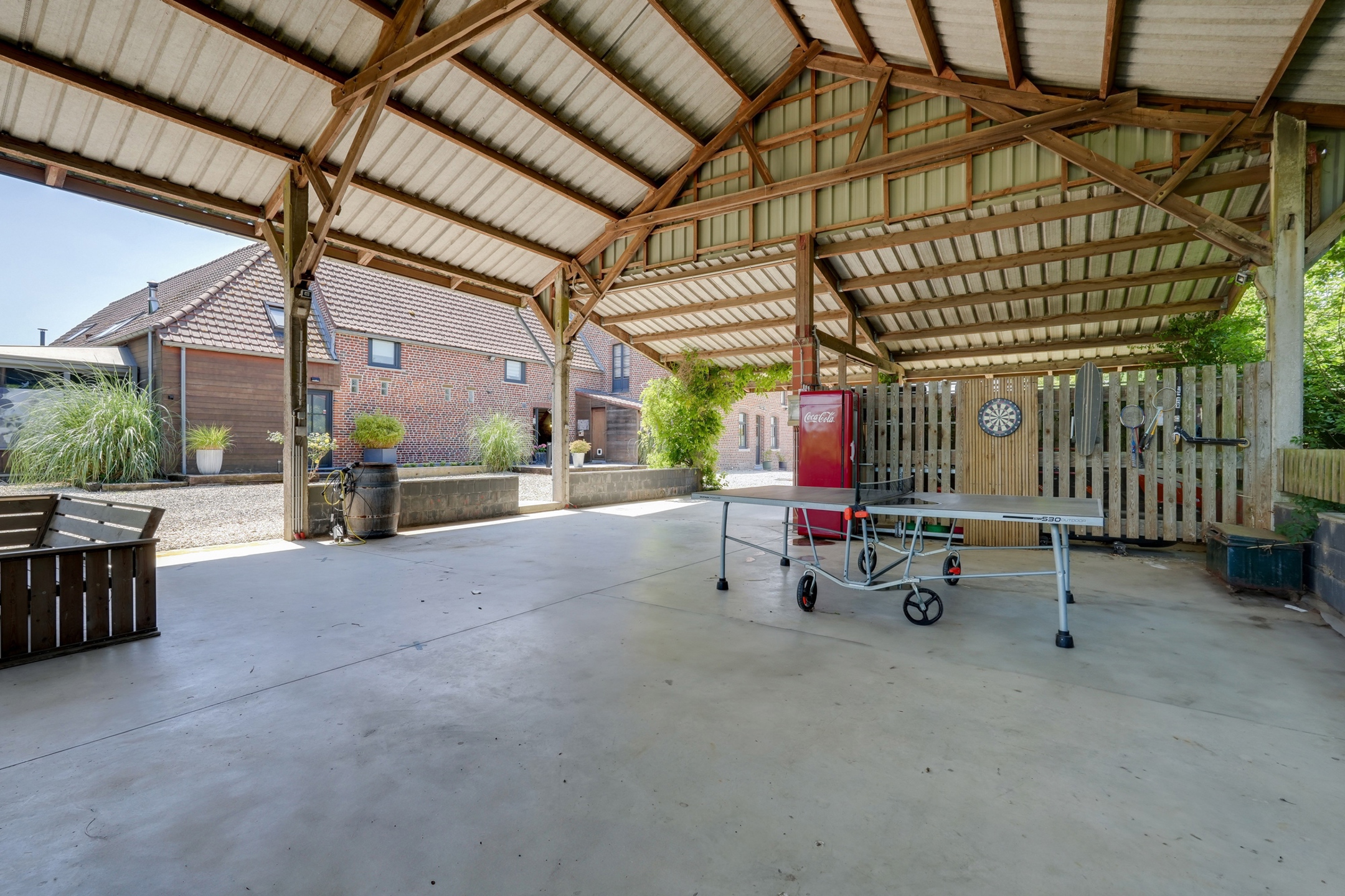 Een ruime overdekte loods van 200 m² vervolledigt het geheel: uitgerust met 42 zonnepanelen, biedt hij opslagruimte, een speelzone, een petanqueterrein en in de nabijheid een parking voor zes voertuigen.