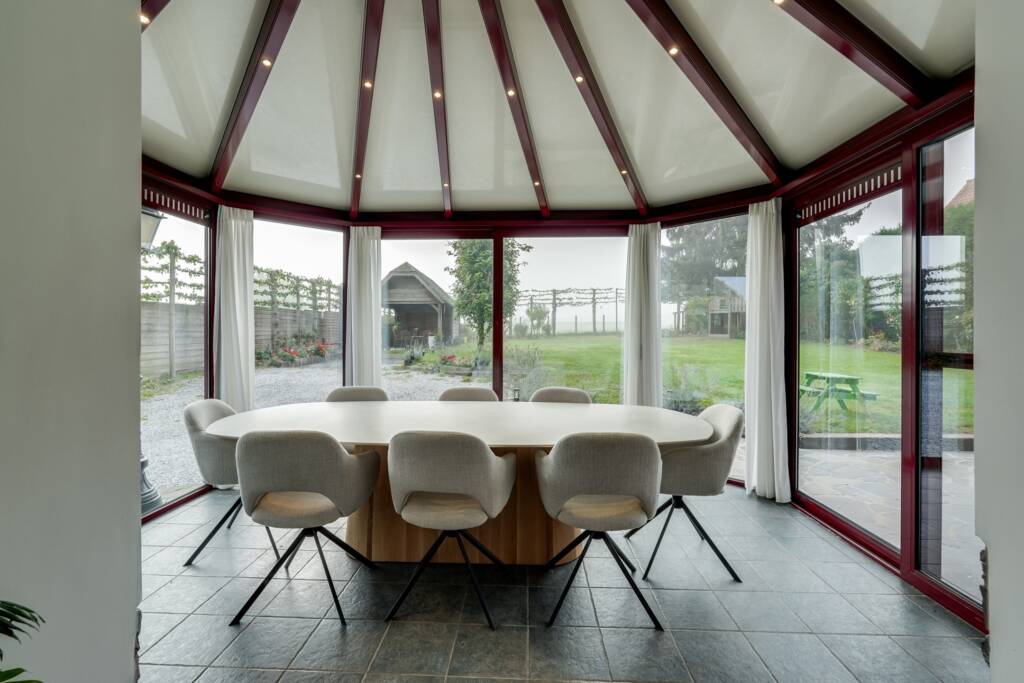 Inkomhal die toegang geeft tot een ruime woonkamer met open keuken, en tot een veranda met prachtig uitzicht op de zitkamer.