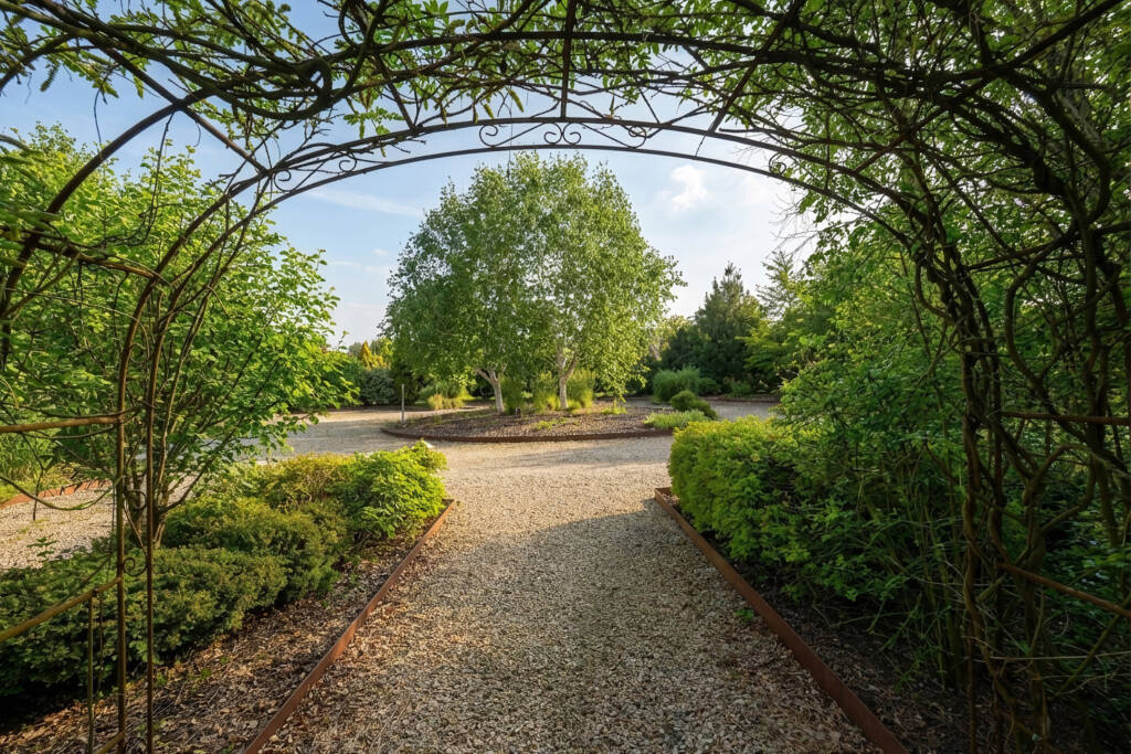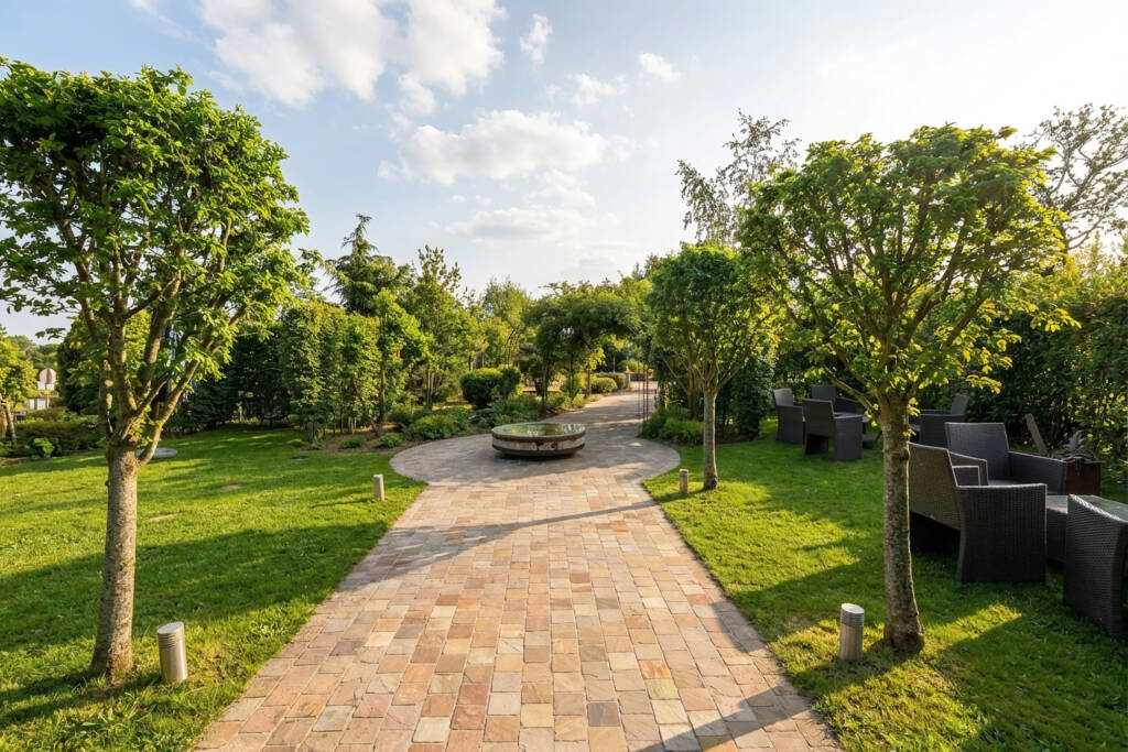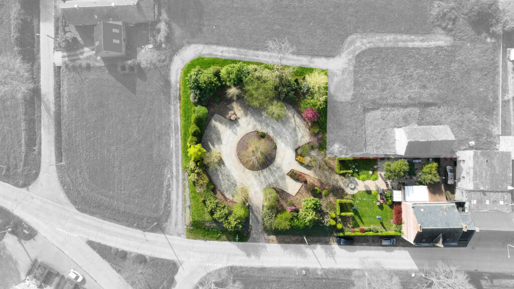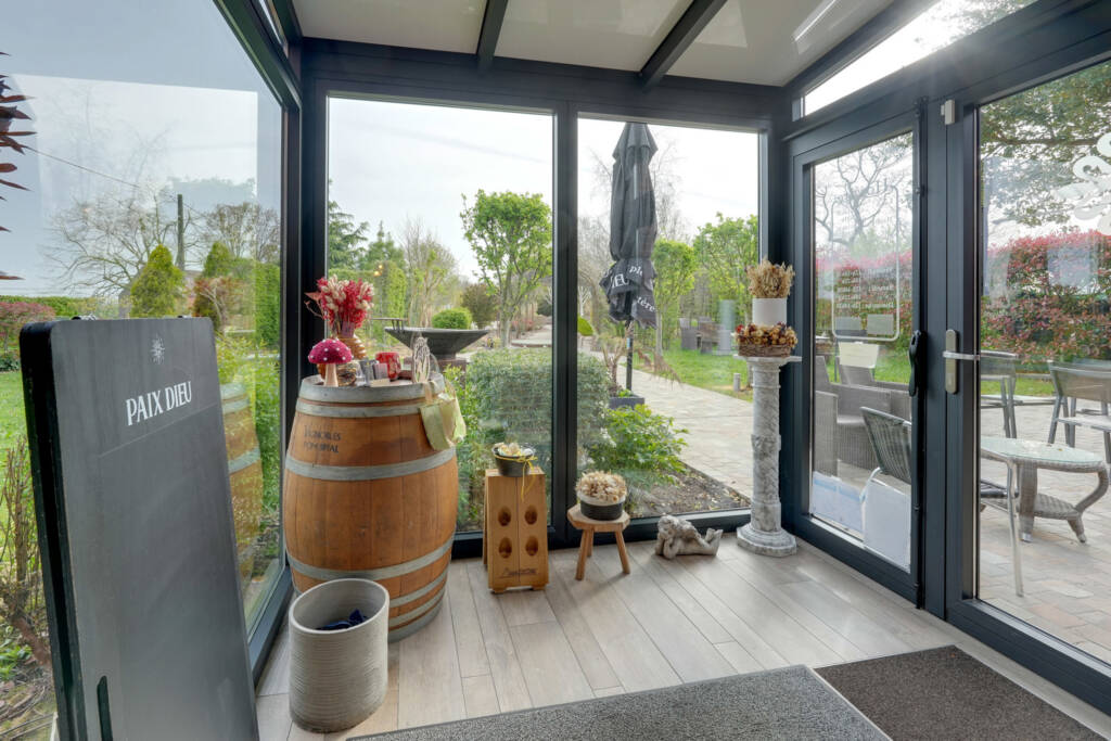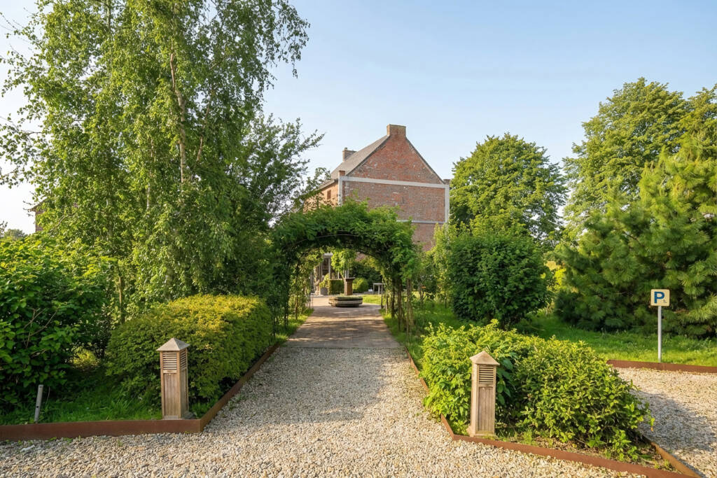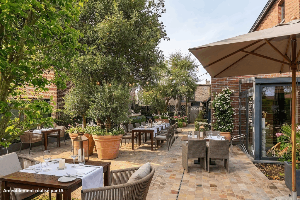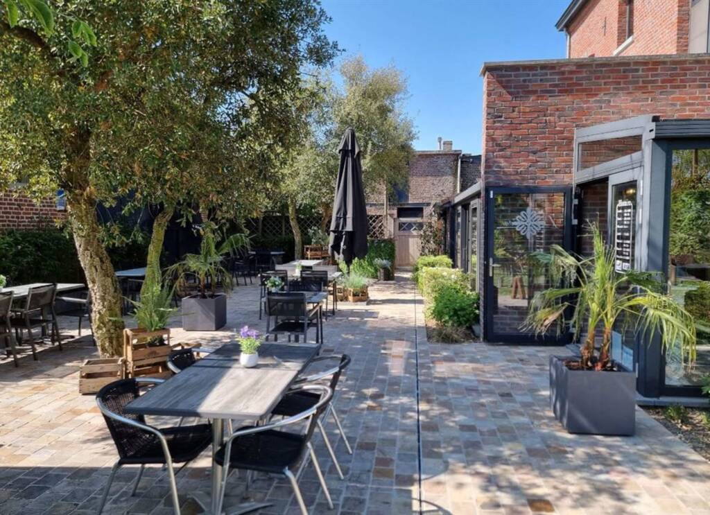 Buiten geniet u van een zuidgerichte terras in natuursteen dat uitgeeft op een verzorgde tuin, met de mogelijkheid om ongeveer 50 couverts te ontvangen. Daarnaast beschikt het pand over een ruime parking met plaats voor een vijftiental wagens.
