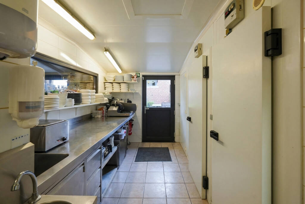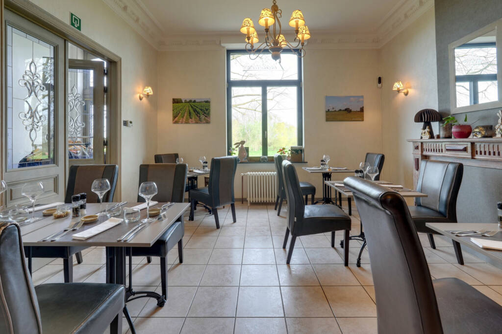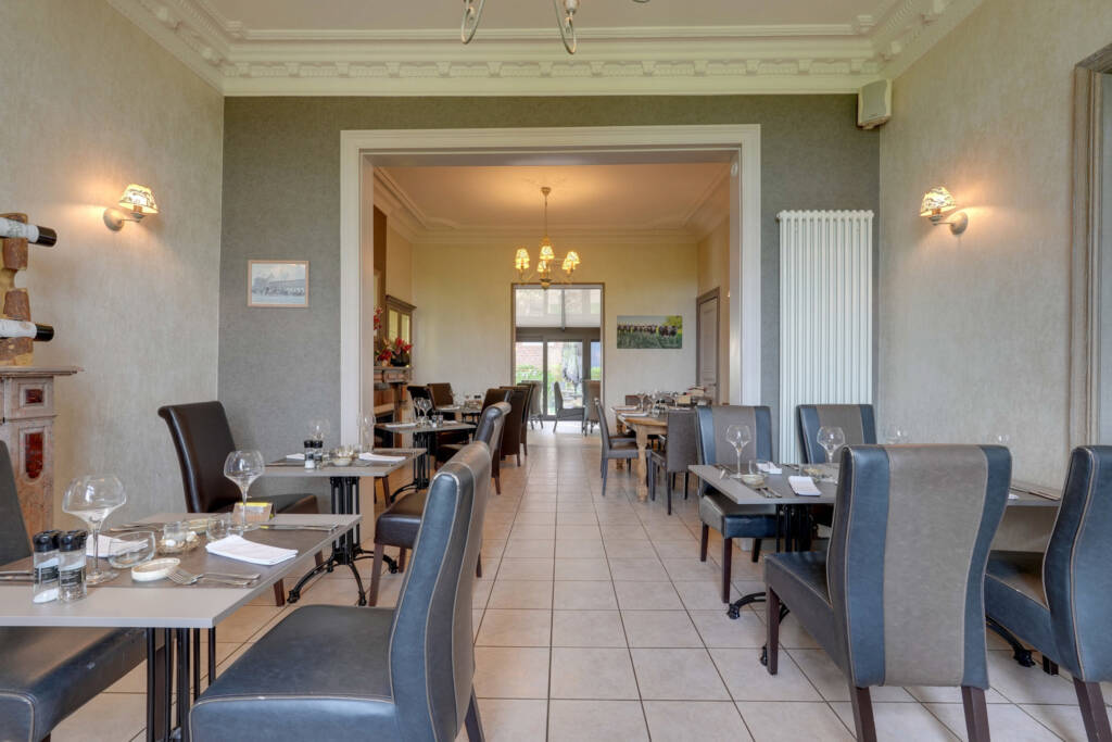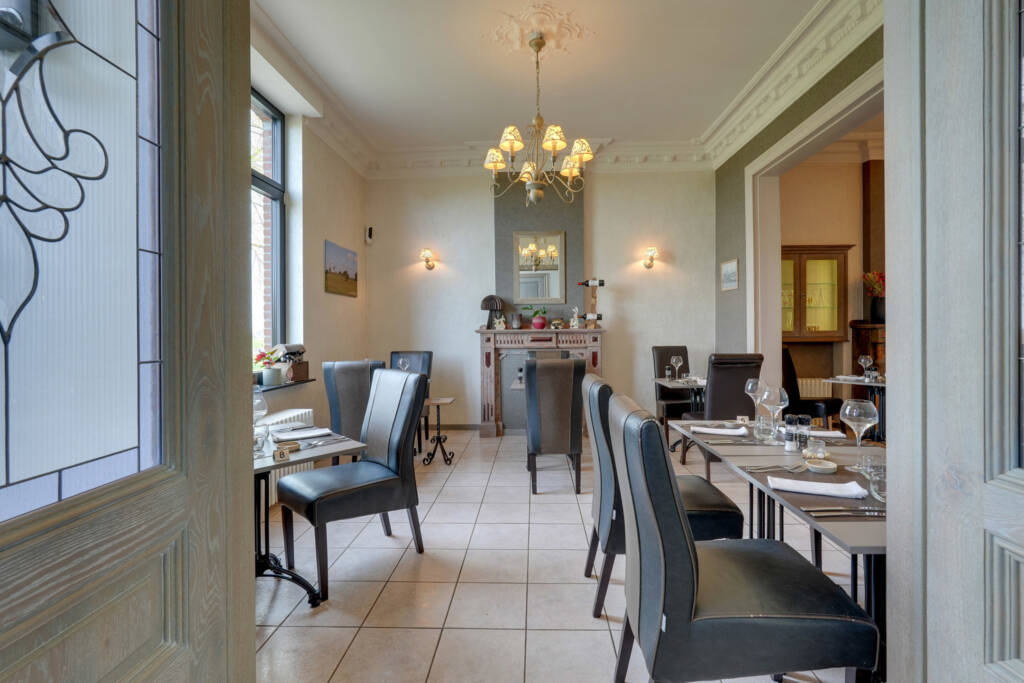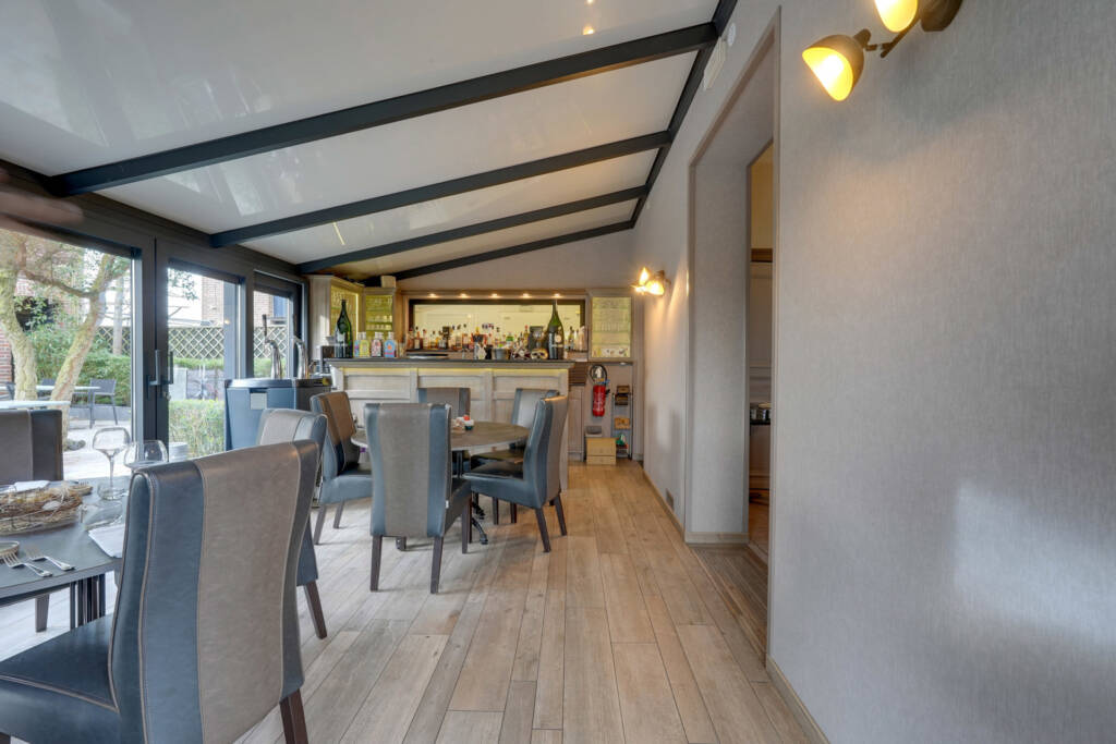 Het gelijkvloers overtuigt door zijn royale volumes en overvloedige lichtinval: een ruime leefruimte (ca. 36 m²), een volledig uitgeruste professionele keuken met koelcel, een lichtrijke veranda met bar (ca. 22 m²) en sanitaire voorzieningen met toegang voor mindervaliden. Momenteel is er plaats voor ongeveer 30 couverts binnen, ideaal voor horeca-activiteiten of een vrij beroep.