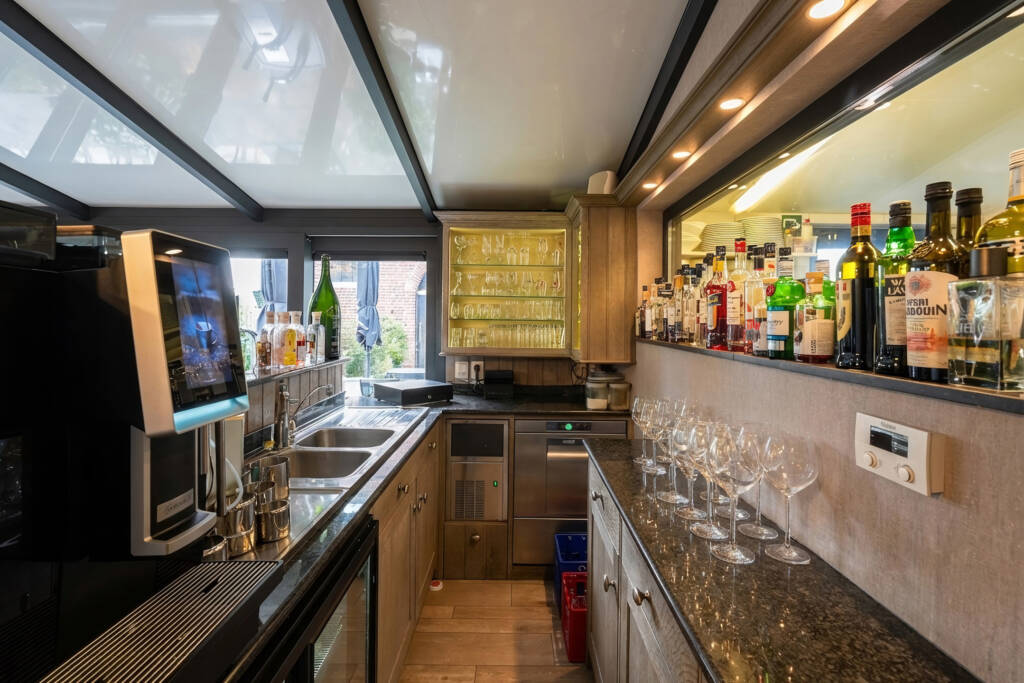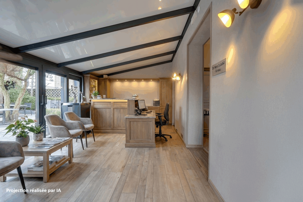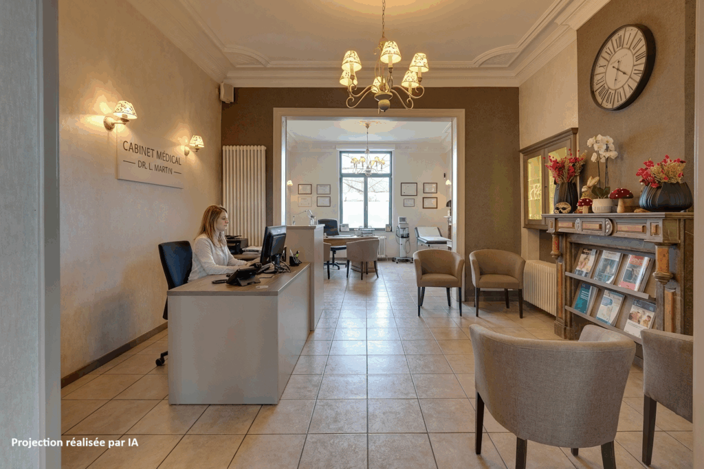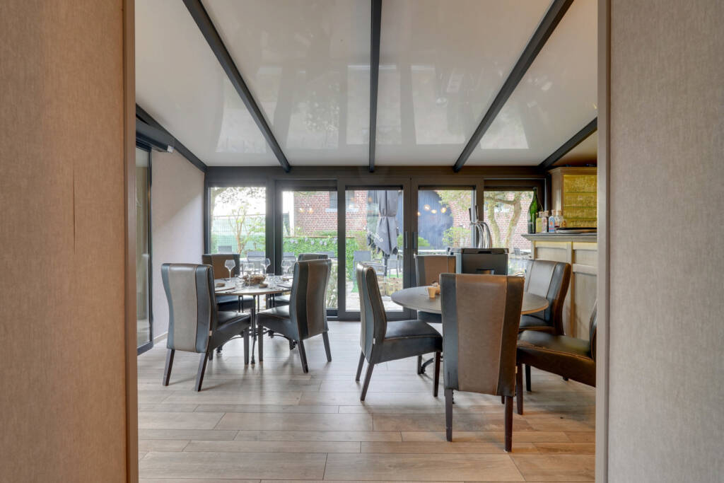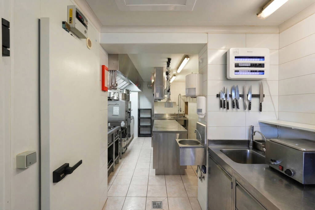 Het gelijkvloers overtuigt door zijn royale volumes en overvloedige lichtinval: een ruime leefruimte (ca. 36 m²), een volledig uitgeruste professionele keuken met koelcel, een lichtrijke veranda met bar (ca. 22 m²) en sanitaire voorzieningen met toegang voor mindervaliden. Momenteel is er plaats voor ongeveer 30 couverts binnen, ideaal voor horeca-activiteiten of een vrij beroep.
